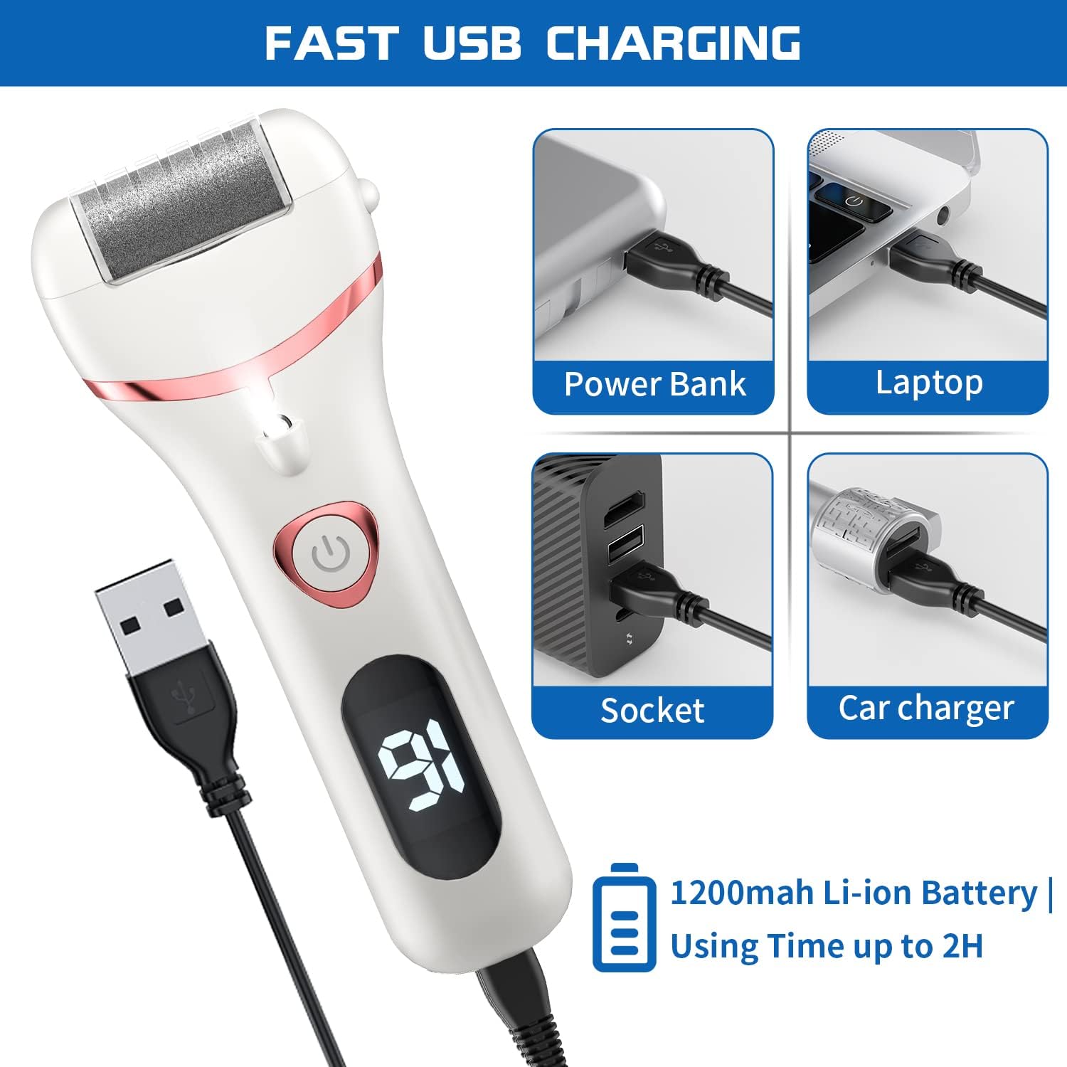 - 【Rechargeable & Equipped with Lcd Digital Battery Display and Light】The electric foot file with high quality 1200mAh large capacity lithium battery can working for about 60-90 Minutes. Only charge about 2-3 Hours. And it equipped with lcd digital battery display and light, you can see how much battery left and when to charge. Foot care for women, this foot scrubber dead skin remover's light turns on automatically while the foot file is working, shining light on your dead skin.