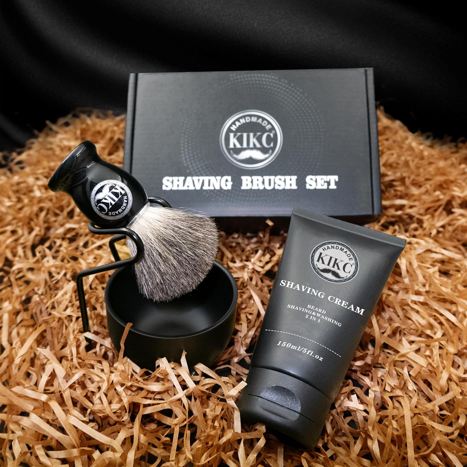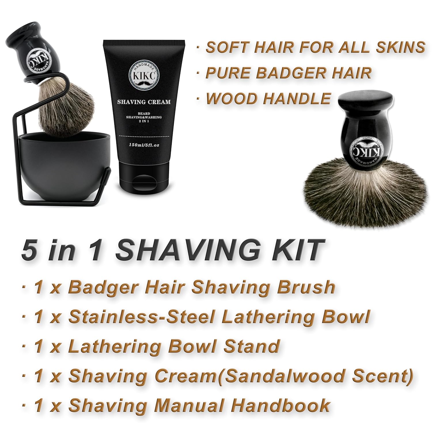 - 【Shaving Kit All in 1】 This kit includes all you need for wet shaving. One handmade shaving brush with pure badger hair bristle; one stainless-steel soap cup for creating lather; one shave cream 5 fl oz; one high quality stainless steel shaver brush stand; a handbook for first shave