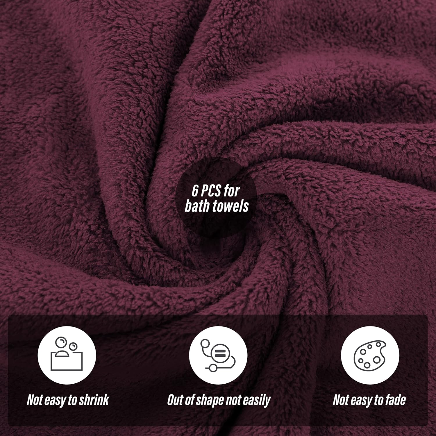 MOONQUEEN 6 Pack Premium Bath Towel Set - Quick Drying - Microfiber Coral Velvet Highly Absorbent Towels - Multipurpose Use as Bath Fitness, Bathroom, Shower, Sports, Yoga Towel (Burgundy)