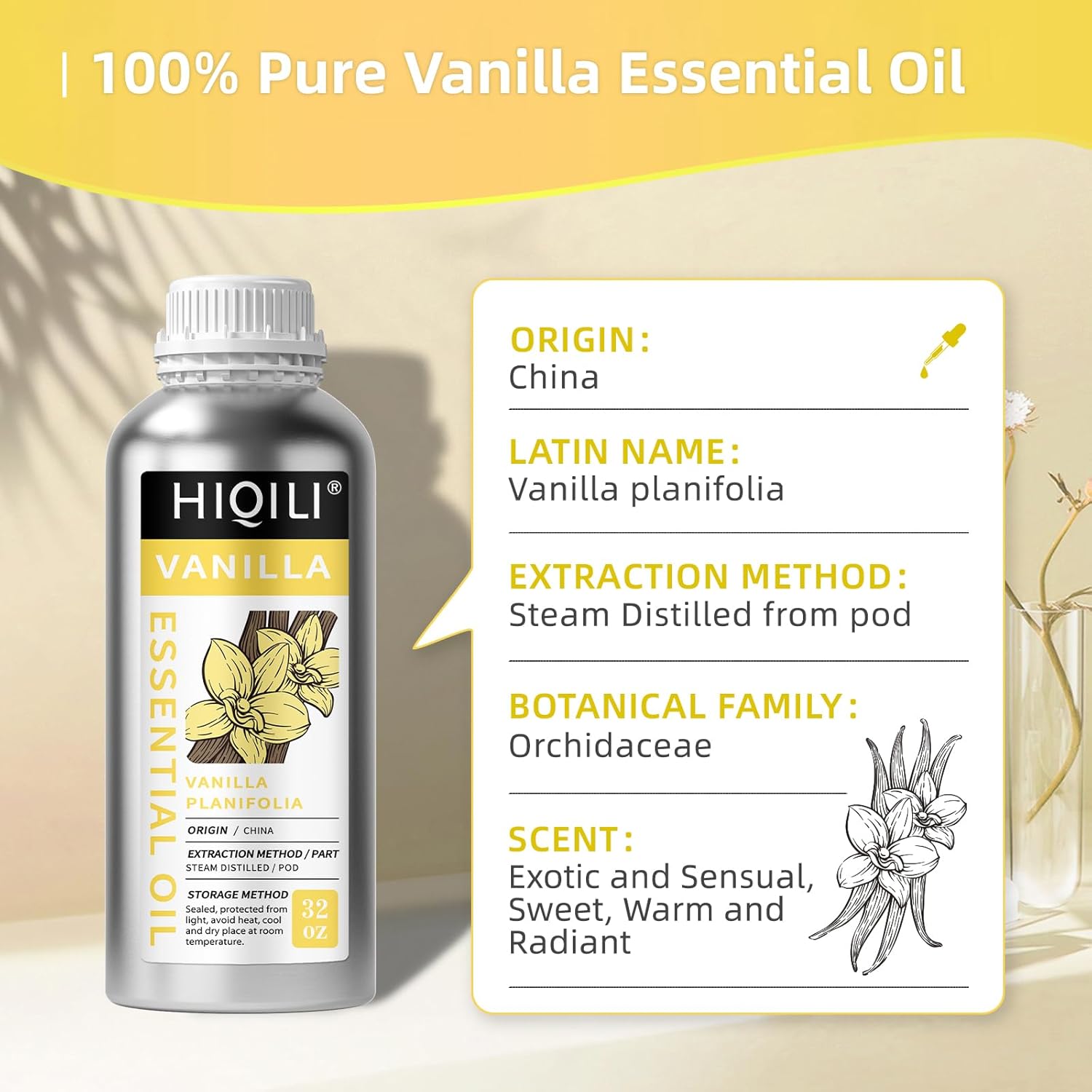 - Ingredient & Aroma: Our raw materials are sourced from China and extracted using the traditional steam distillation method. 100% pure vanilla essential oil has a fresh, slightly herbaceous aroma and a sweet, refreshing sensation