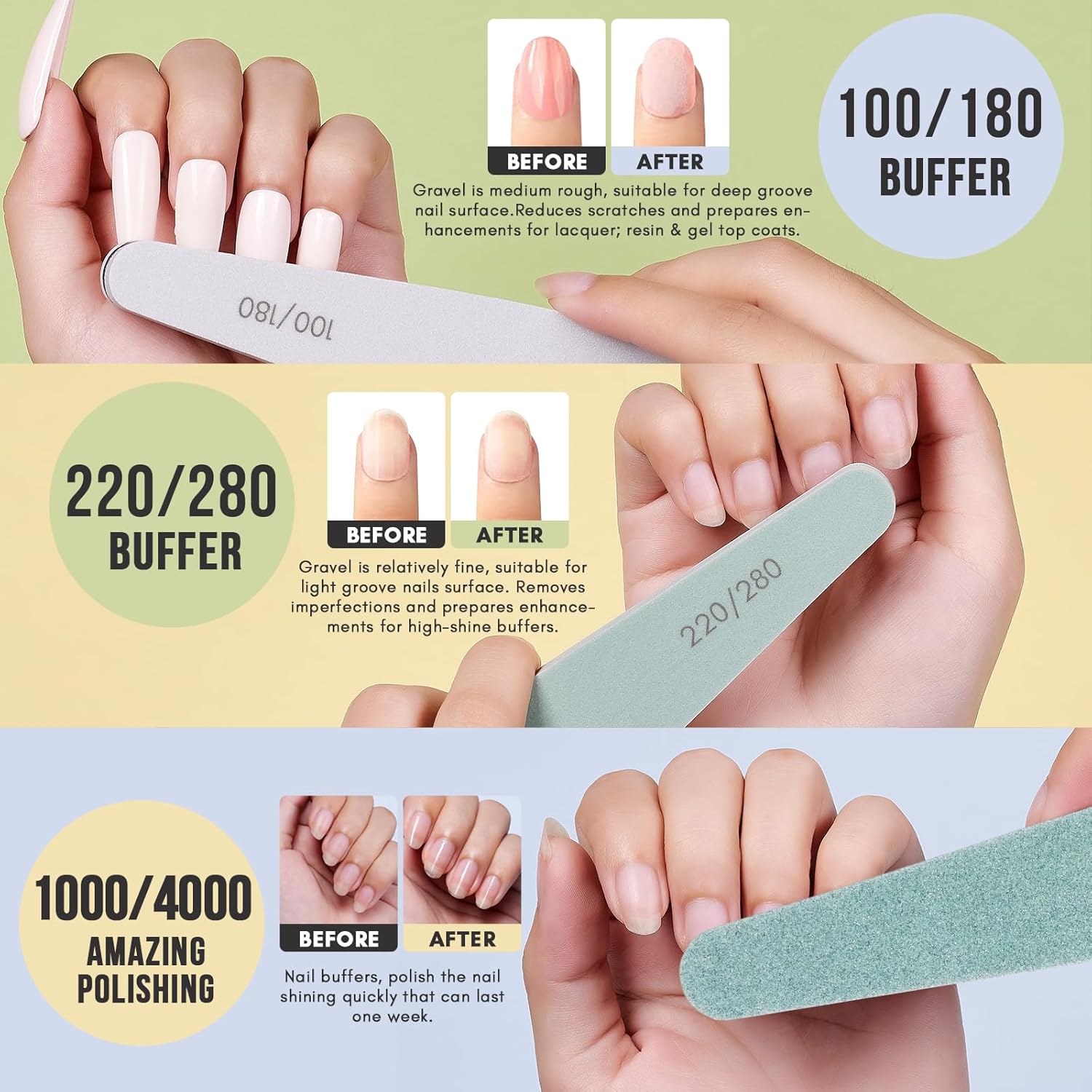 - Different Girts, Function Differently - Multifunctional Nail file kit includes Silver 150 Cushioned Board, Silver 180 Cushioned Board, White 240 Cushioned Board, Gray 100/180 Buffer, White/Moss 220/280 Buffer, Green/White400/3000 Shine, different girts function differently.