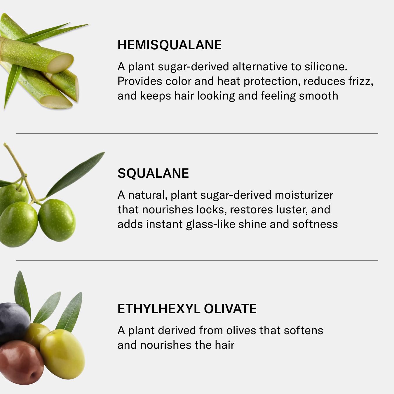 - Hero Ingredients: Hemisqualane – a plant sugar-derived alternative to silicone that reduces frizz and keeps hair looking and feeling smooth. Squalane: A natural, plant sugar-derived moisturizer that nourishes locks, restores luster, and adds instant glass-like shine and softness. Ethylhexyl Olivate: A plant derived from olives that softens and nourishes the hair