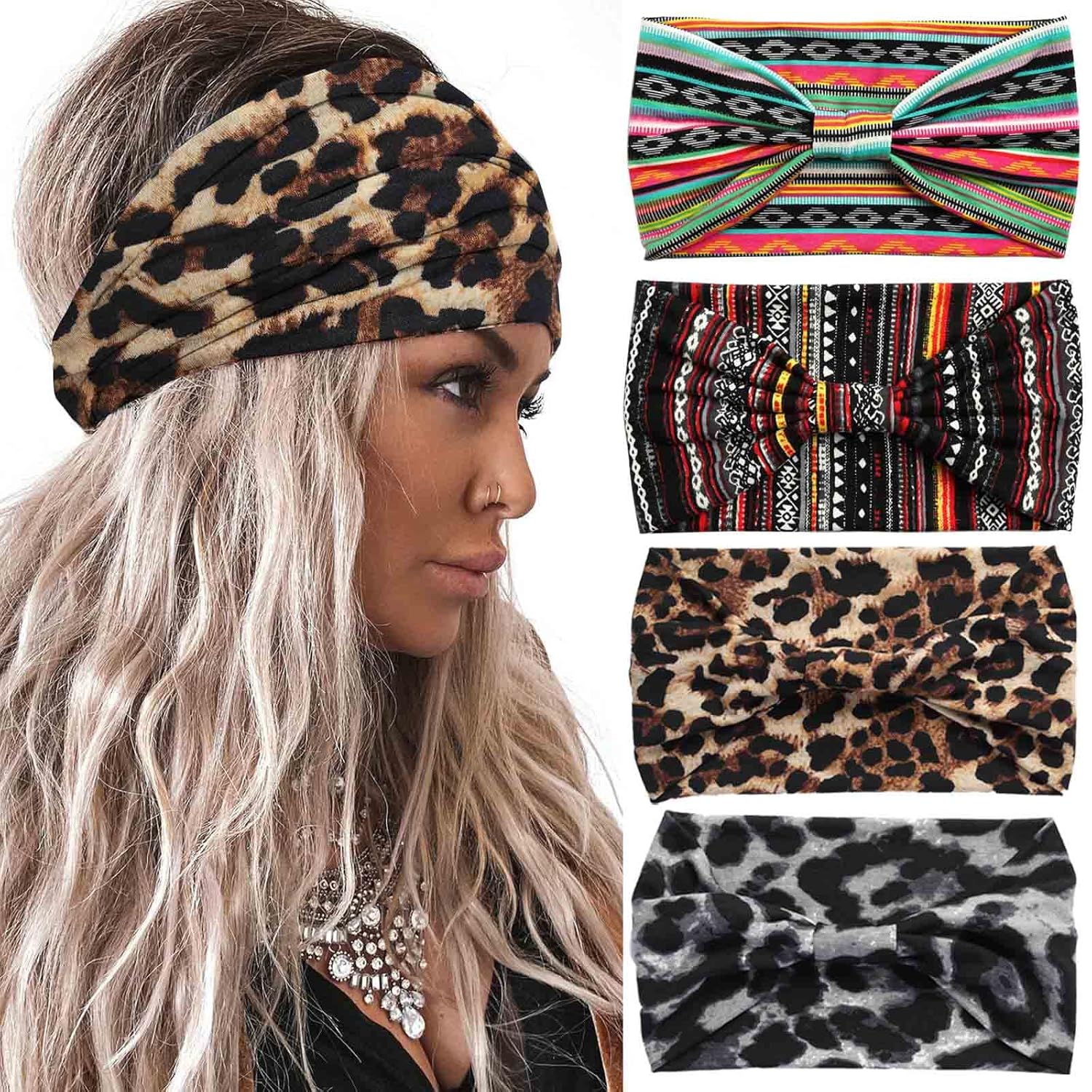 Acenail Wide Headbands for Women, 4 Pack Knotted Turban Headband, Non Slip Hairbands, Floral Workout Head Bands, Leopard Yoga Sweatbands, Cotton Hair Scarfs, Boho Head Wraps, Fashion Hair Accessories