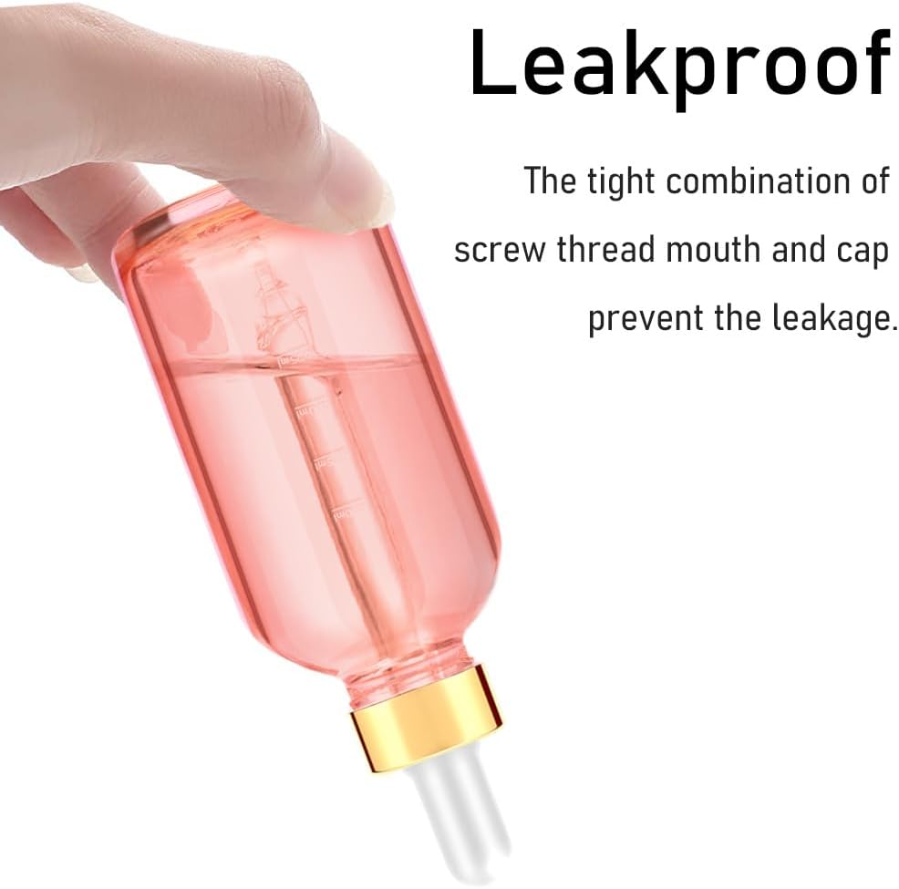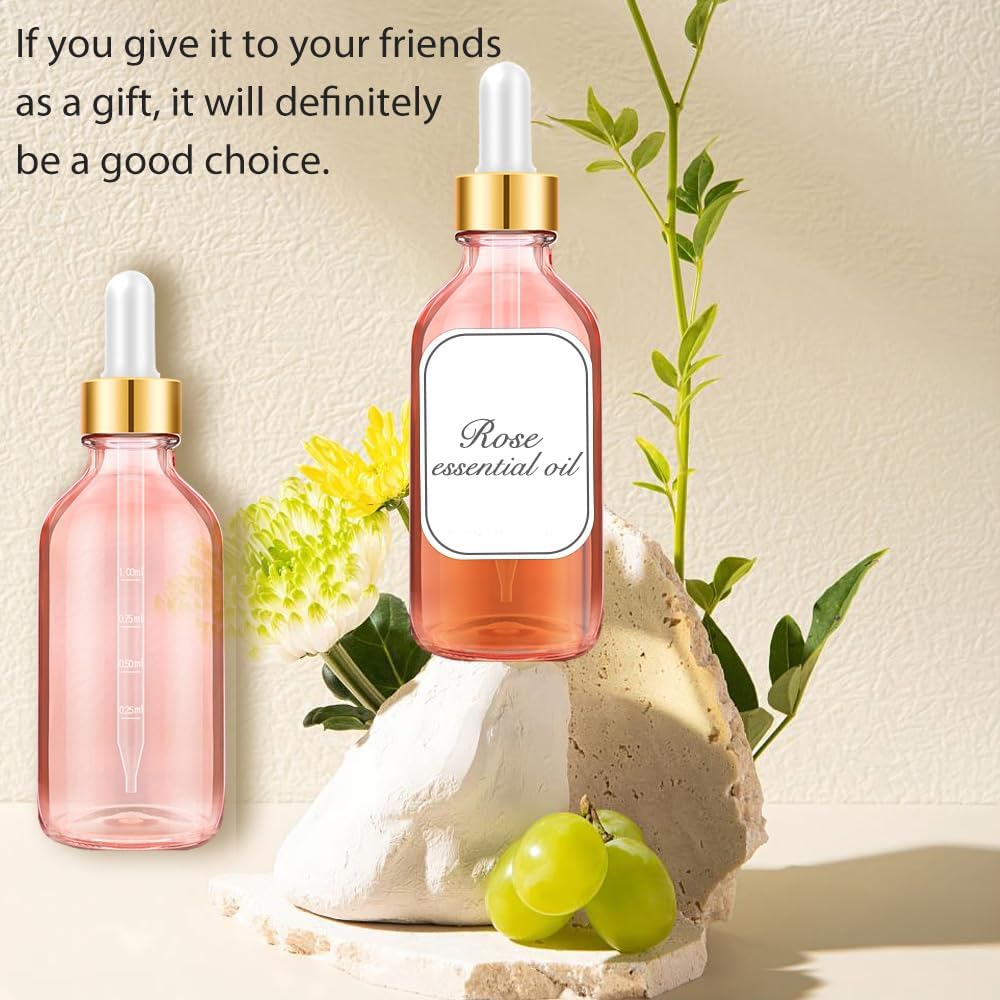 Bumobum Glass Bottle with Dropper, 4 oz Pink Tincture Bottle for Essential Oils with Labels and Funnels, 2 Pack Eye Dropper Bottles with Golden Top (Unbreakable Plastic Eye Dropper with Measurements)