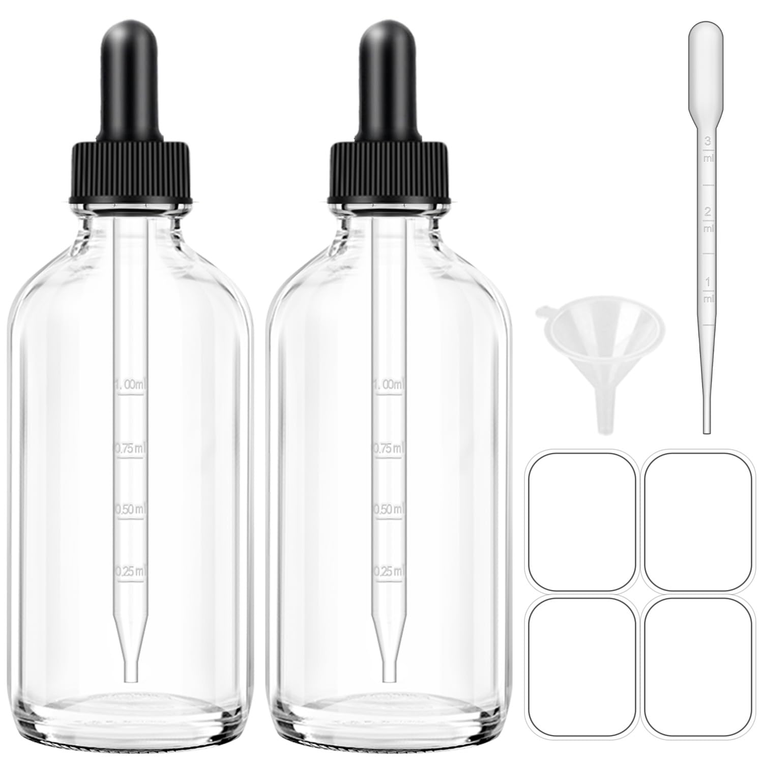Bumobum Dropper Bottles, 4oz Clear Bottle with Dropper for Essential Oils with Funnel, Labels & Pipette, 2-Pack Tincture Bottles with Dropper(Unbreakable Plastic Eye Dropper)