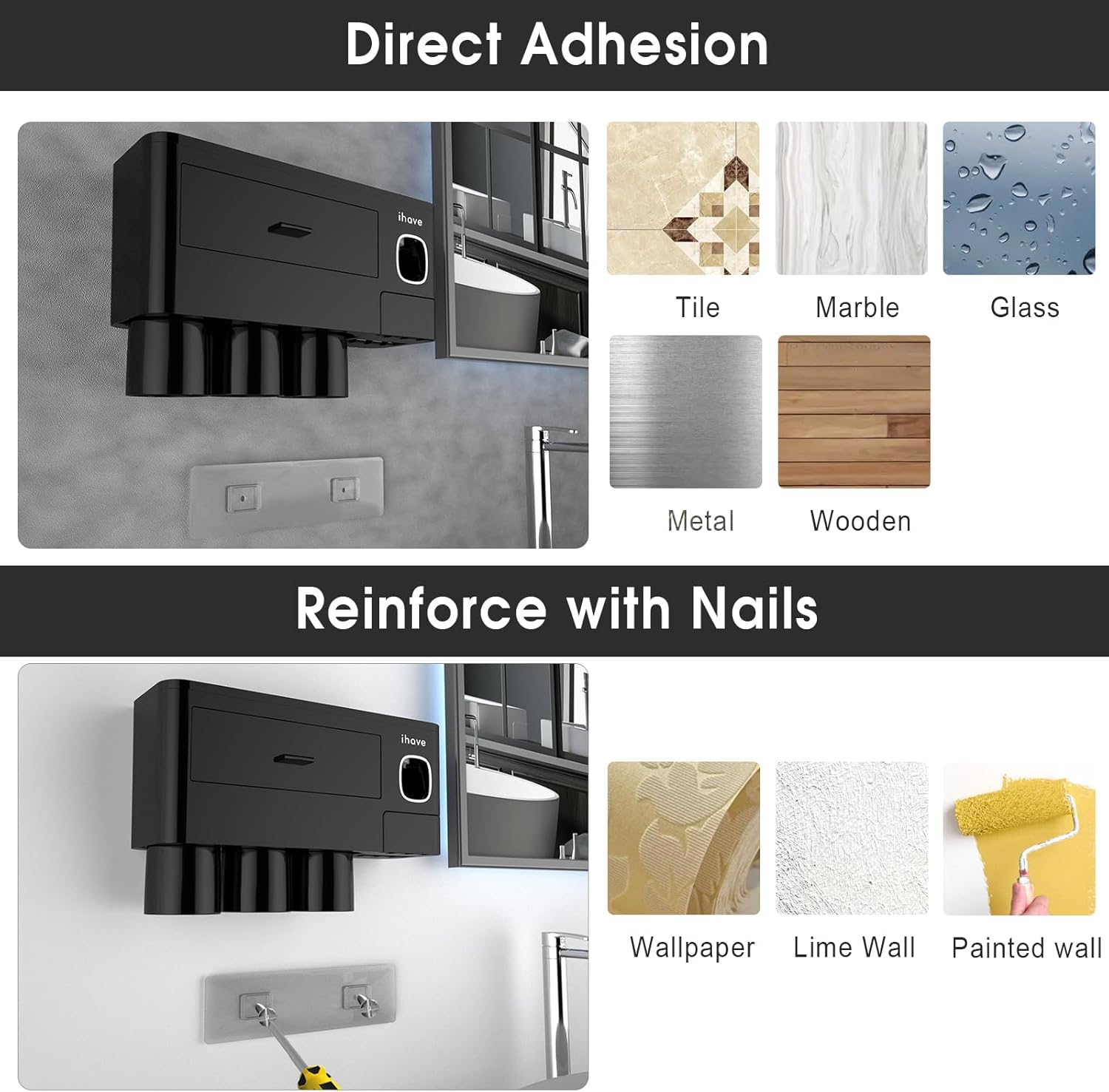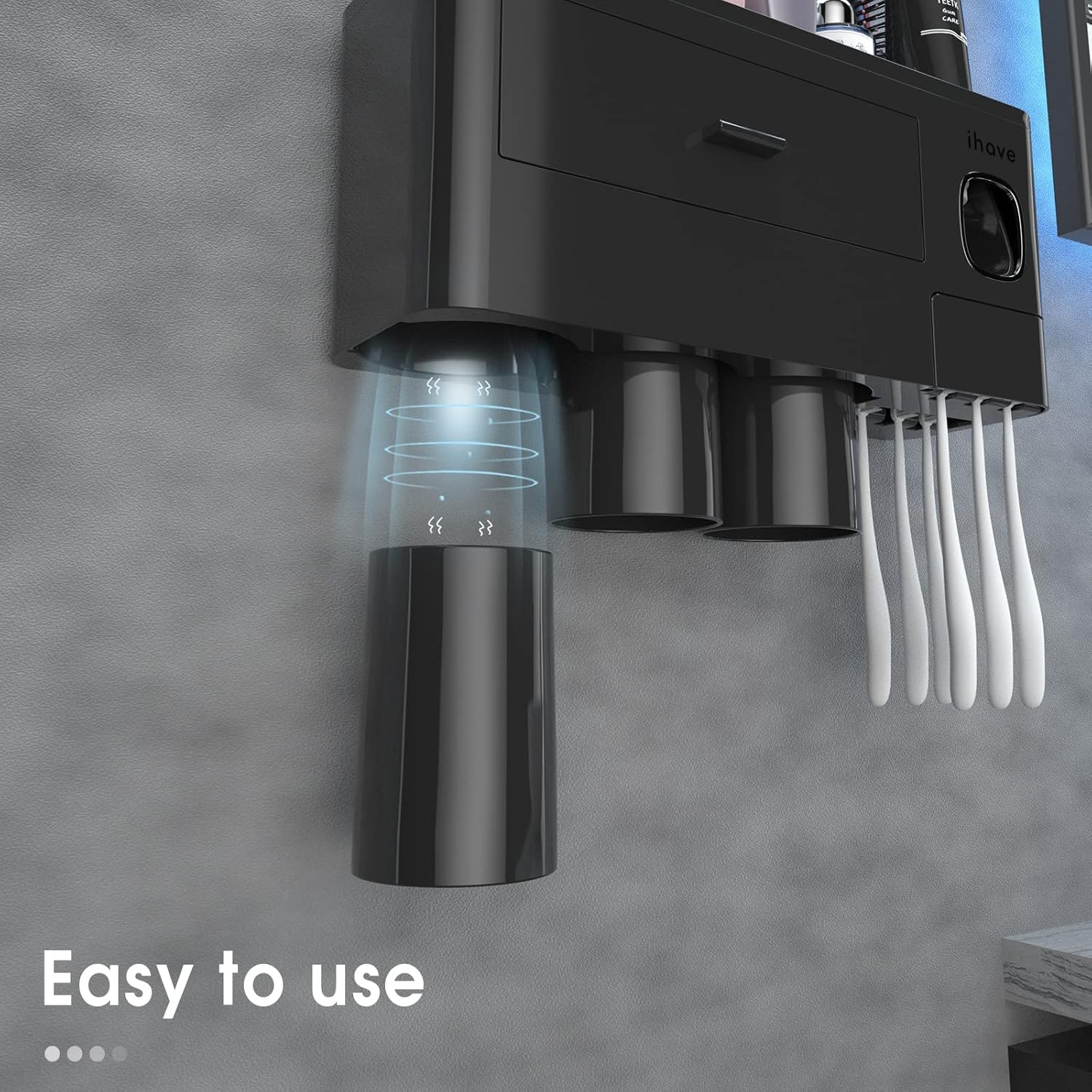 - Multifunction: This multi-function toothbrush holder comes with a automatic toothpaste dispenser, making it easy to squeeze the toothpaste without waste. The 3 magnetic mouthwash cups are designed with an upside-down drain, dust-proof and waterproof. You can hang 6 toothbrushes simultaneously, which is suitable for the whole family.