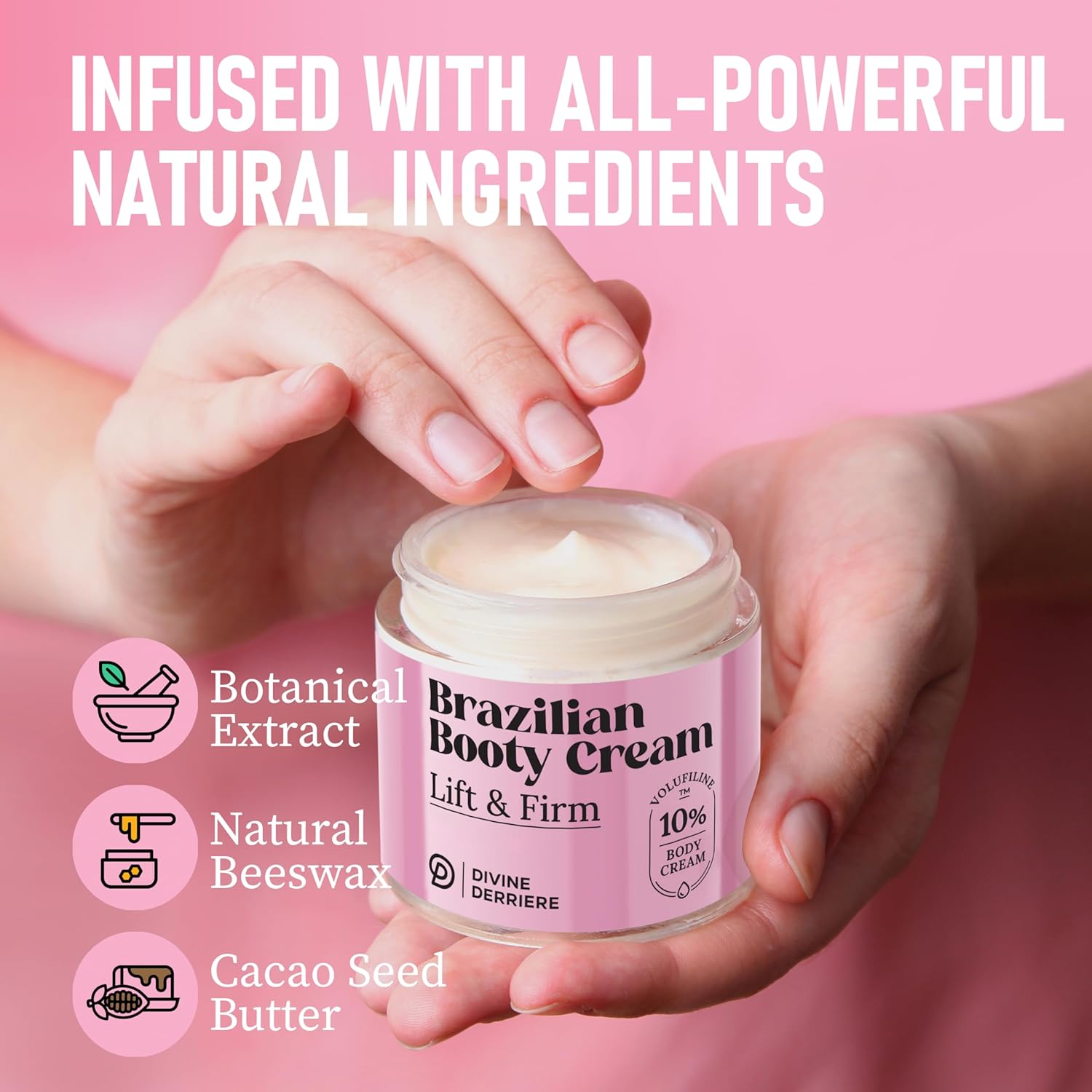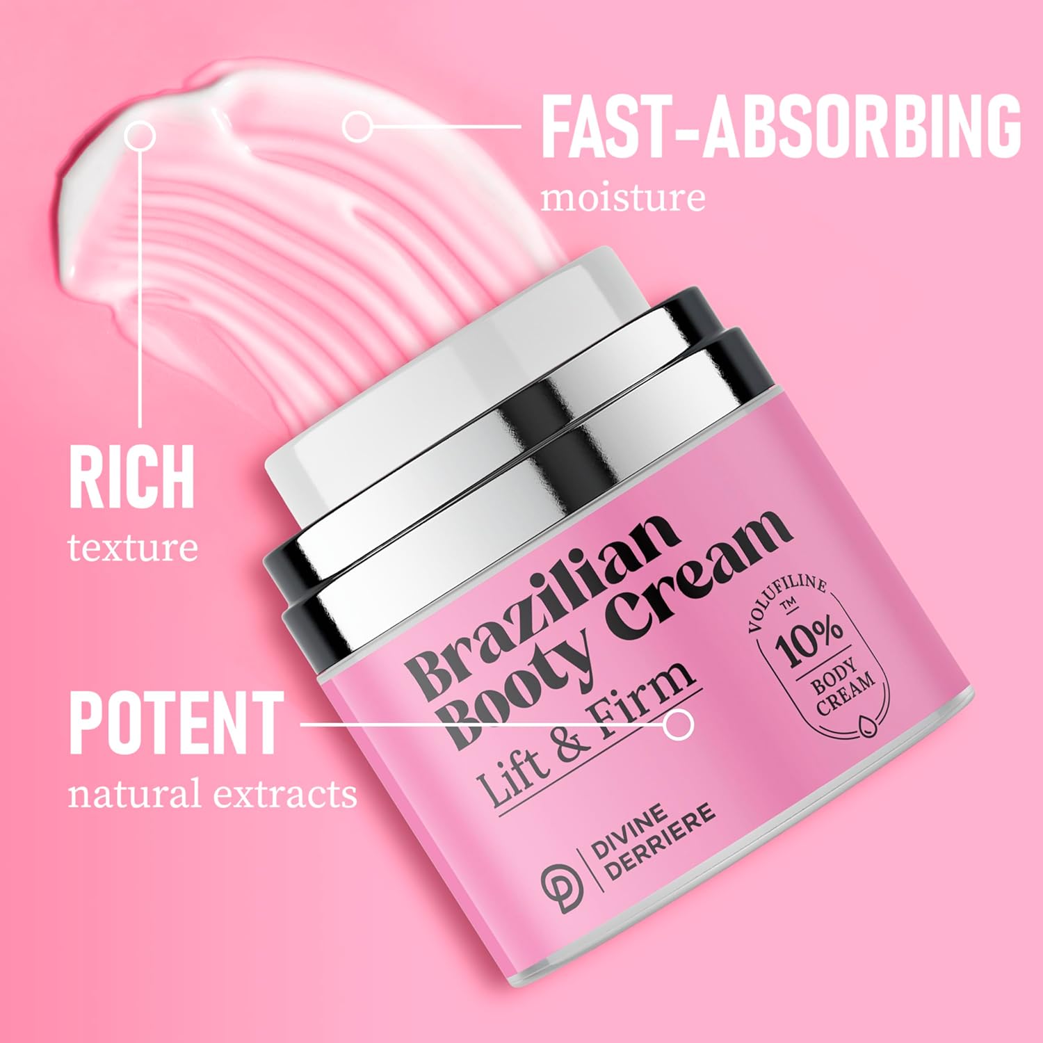 - Proven Effective & Safe - A 56-day trial with 28 participants found that Volufiline, the main ingredient in the Divine Derriere Brazilian Booty Cream helped to smooth and tighten the look of your skin for a sleeker, lifted appearance.