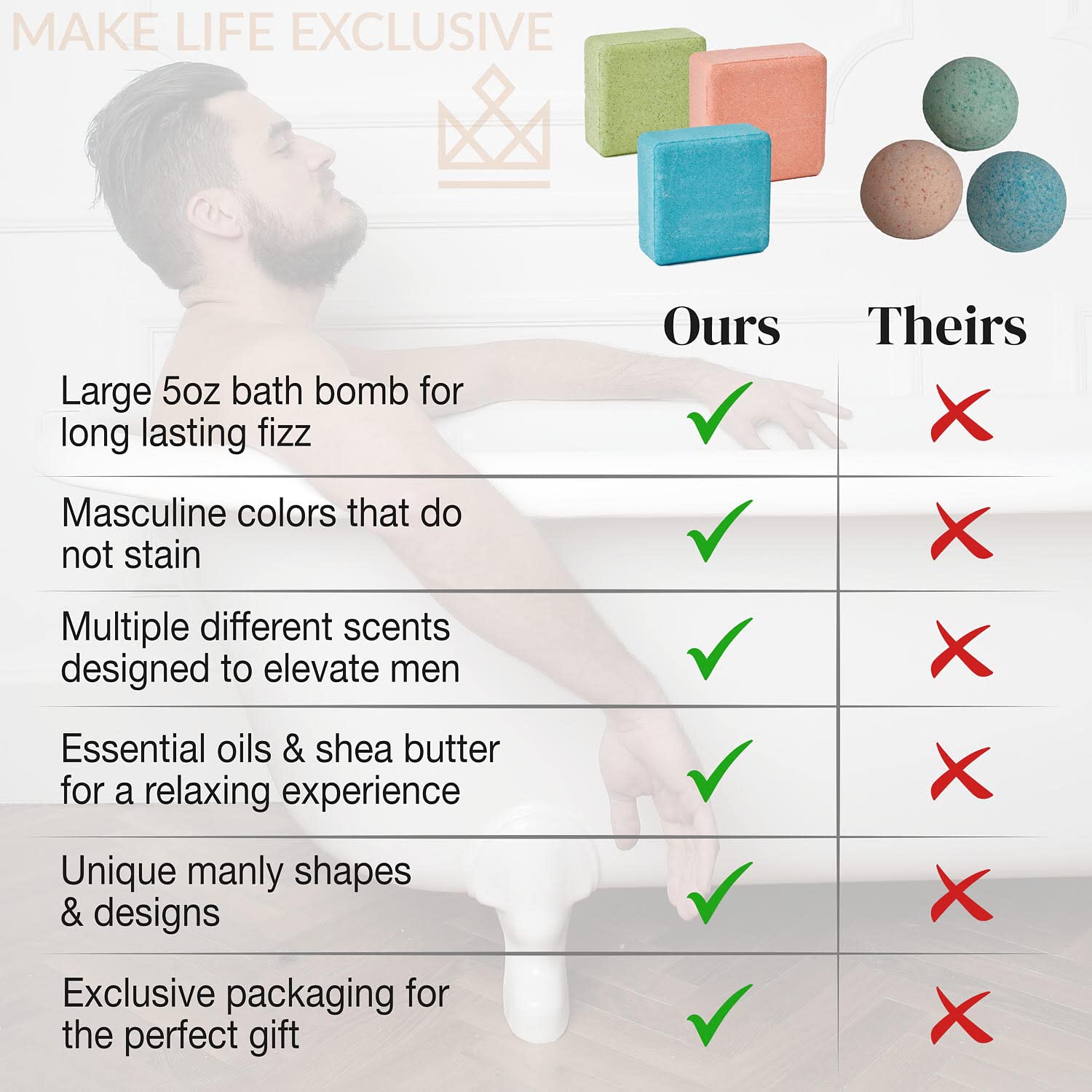 - 👑MAKE LIFE EXCLUSIVE GUARNTEE! - Put your mind at ease with our 1 year money back guarantee! These bath bombs have been tried, tested and voted by men, for men. With these scents, we are confident that everyone will enjoy this aromatic experience!