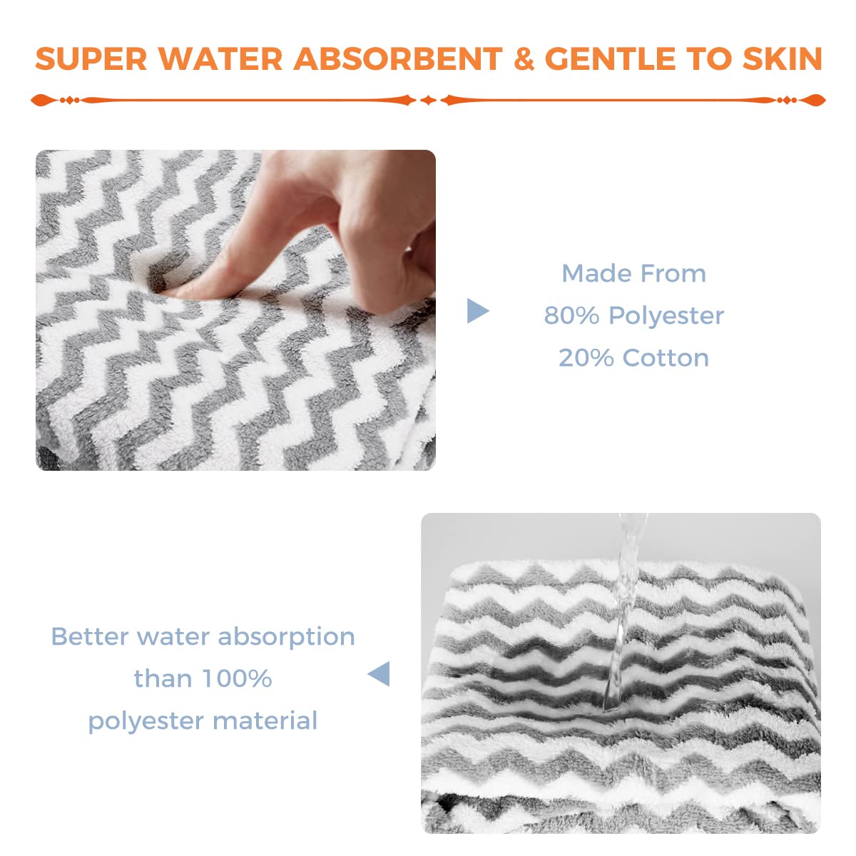 - Absorbent & Fast Dry: Our hair drying towel is made from a soft-touch, highly absorbent microfiber fabric material. Soft microfiber towelettes absorb most of the moisture from wet hair faster than other dry towels. It will be your best assistant to dry your hair.