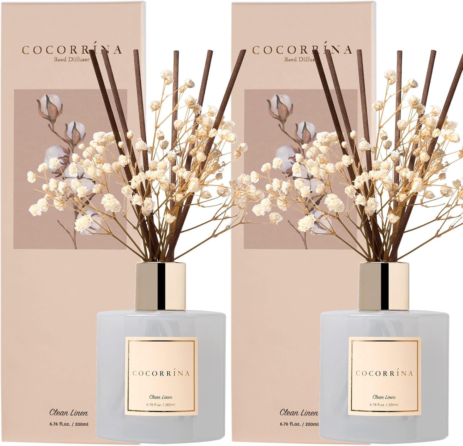 Cocorrína Reed Diffuser Set, 6.7 fl.oz Clean Linen 2 Packs Scented Diffuser with Sticks Home Fragrance Reed Diffuser for Bathroom Shelf Decor