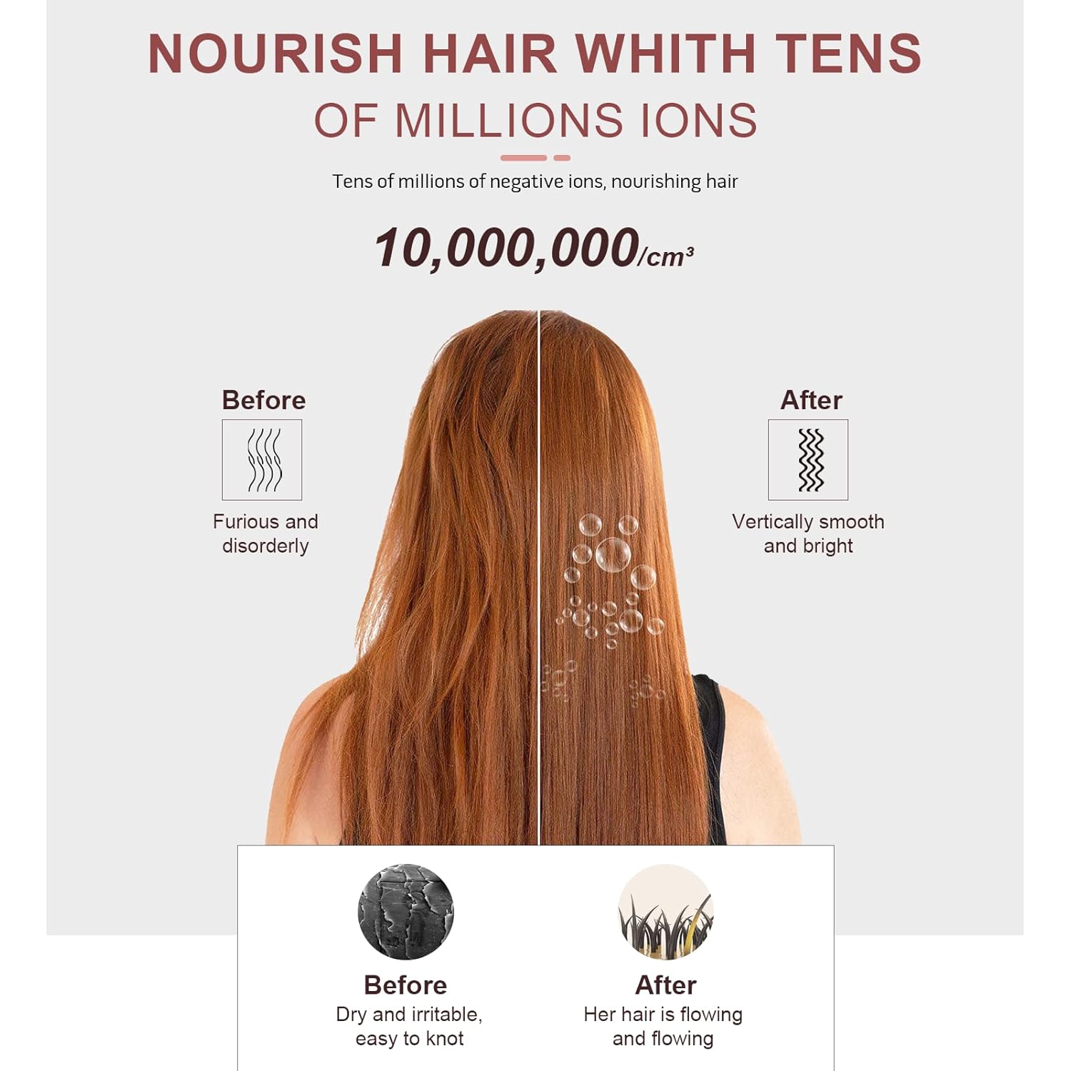 - Hair Protection with Ionizer &Nano Teeth—With over 20 million ions per cm3 and nano ceramic coating of brush teeth, you hair get maximum protection from moisture loss, static and burn. Temperature is controlled more accurately than older version and most other brands.
