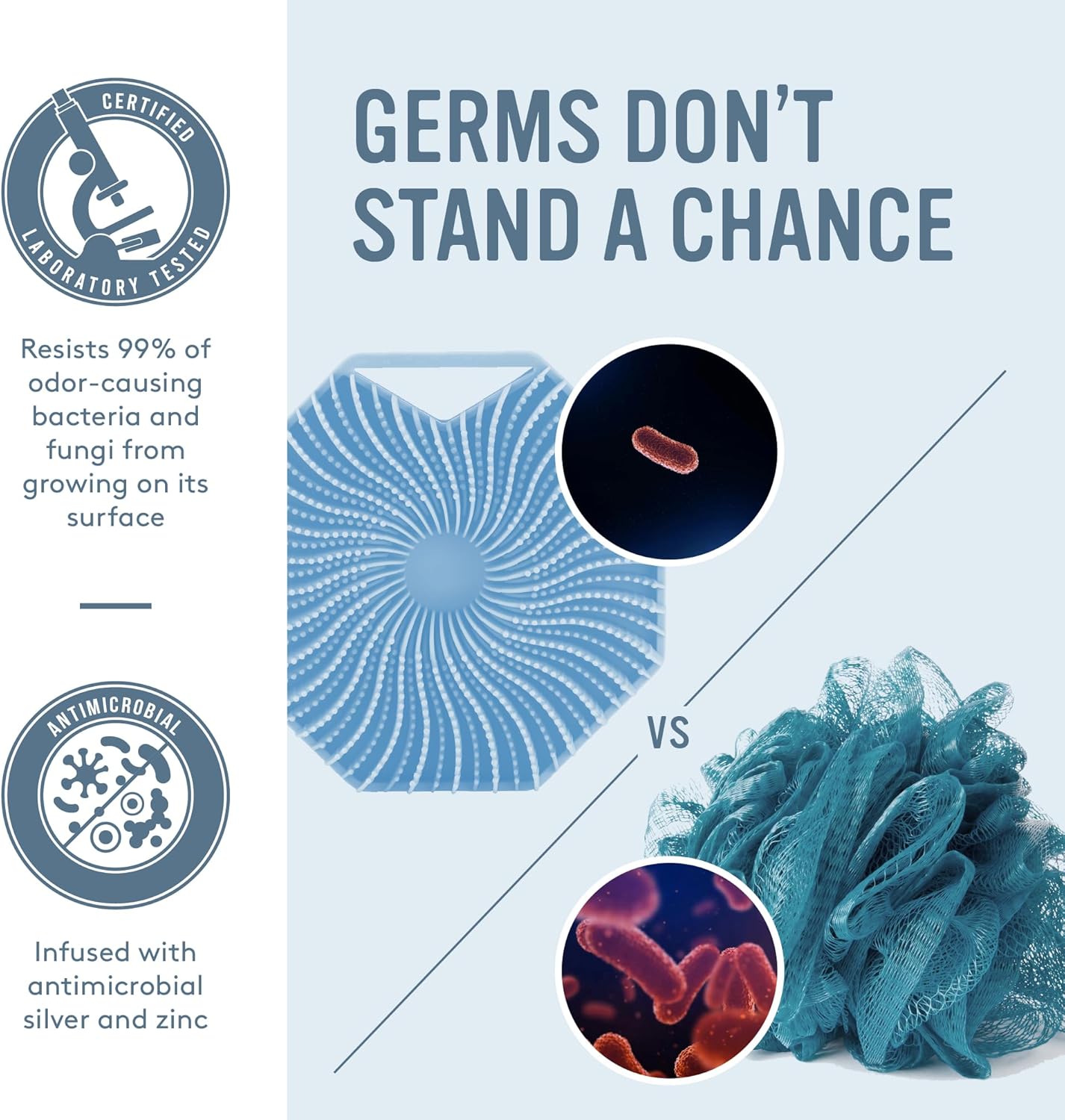 Sud Scrub® Antimicrobial Silicone Body Scrubber, Exfoliating Body Scrubber for Sensitive Skin, Eco Friendly Shower Scrubber for Body, Silicone Body Brush for Showering, Blue
