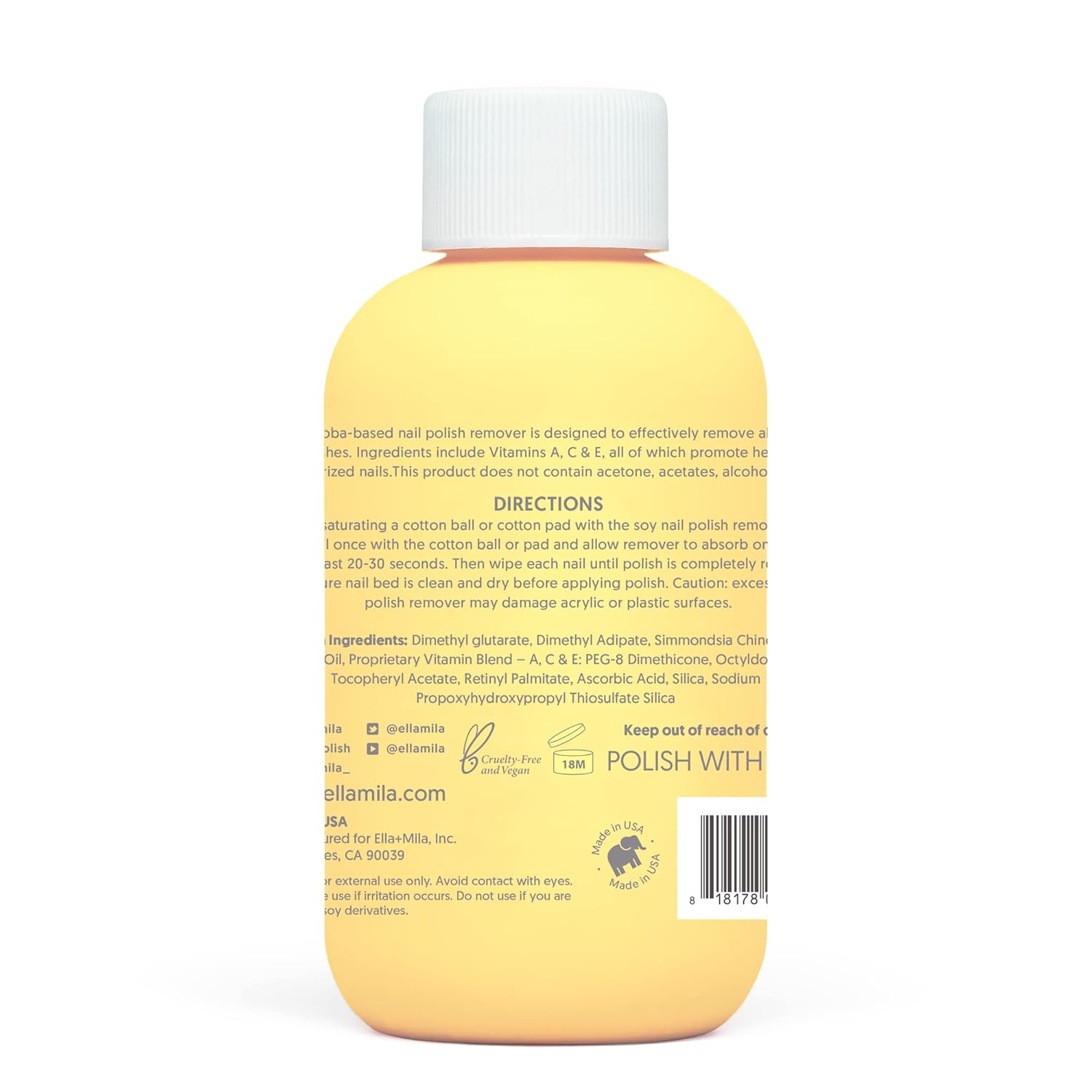 - Proudly Made In USA: Formulated without acetone, alcohol & other harmful chemicals; Our products are safe to use & planet friendly; ella+mila strives to be environmentally responsible & health conscious; Non-toxic nail polish remover you can count on