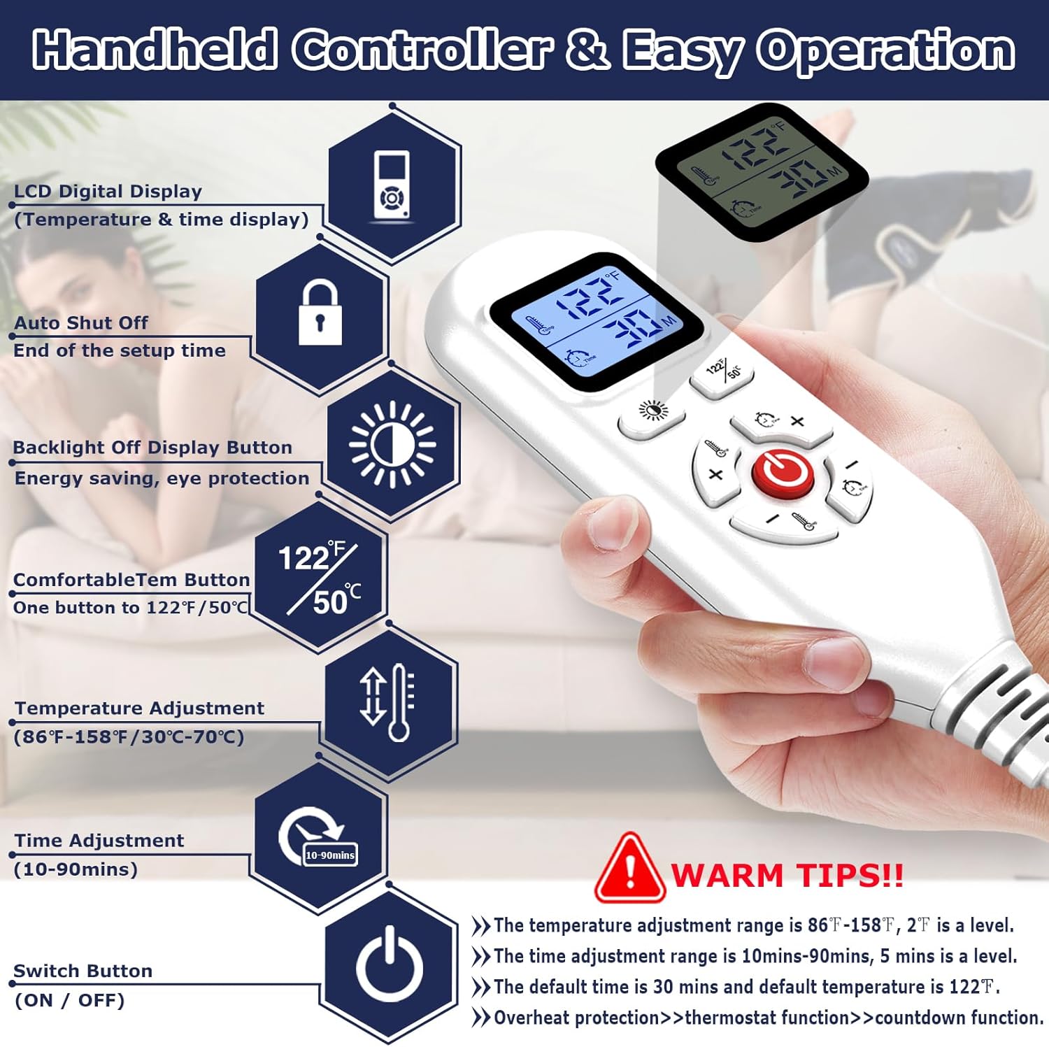 - 【Auto Off & Temperature Adjustable】The temperature is adjustable from 86℉ to 158℉, you can feel the heat within 30 seconds with advanced dense heating wire design. 10 - 90min time adjustable. Time is up, the heated foot wrap will auto shut off, which is very safe and energy saving. You can control temp and time easily to accommodate your comfort. And offer huge warmth to whom with cold foot in cold days and winter