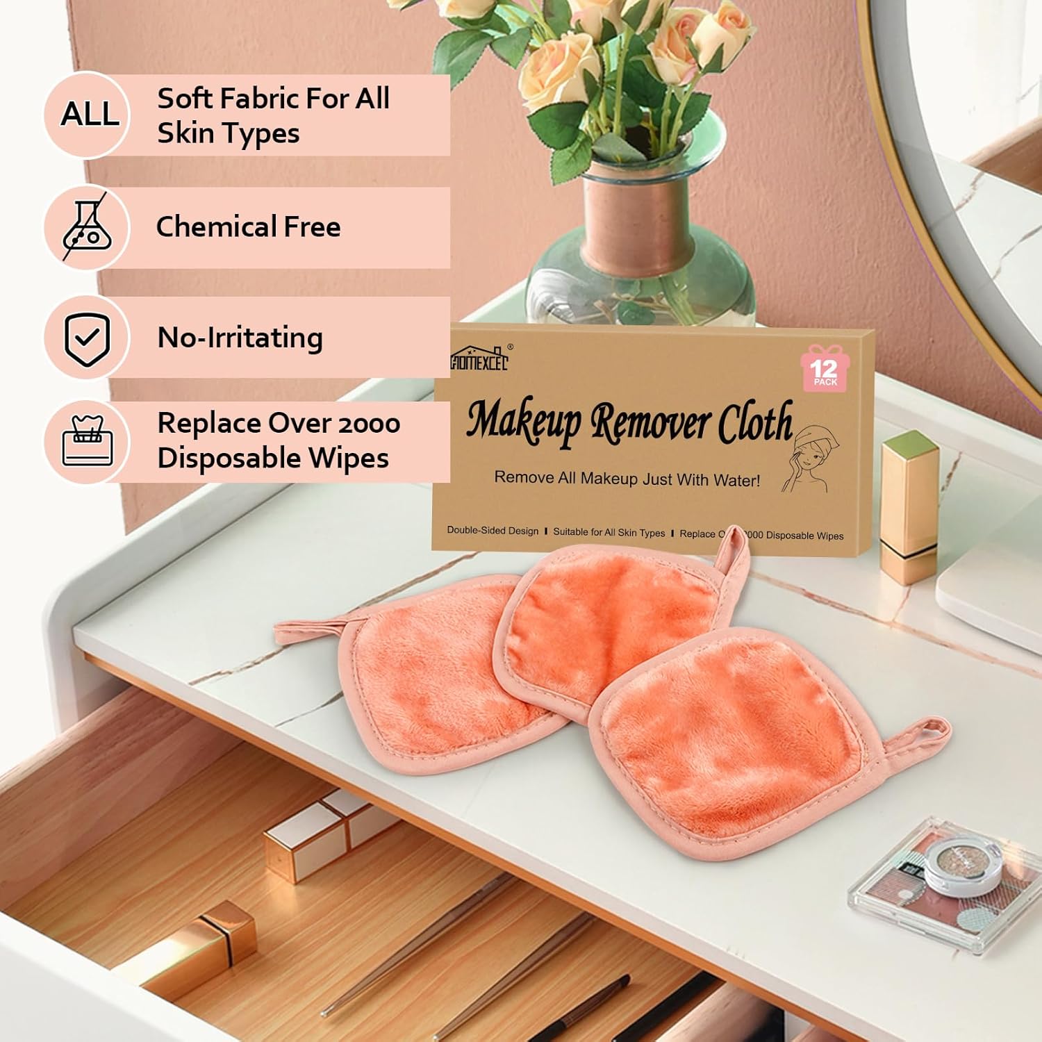 HOMEXCEL Makeup Remover Cloth 12 Pack, Reusable Makeup Remover Pads, Washable Ultra Soft Facial Cleansing Cloths For All Skin Types, 5 X 5 In, Pink