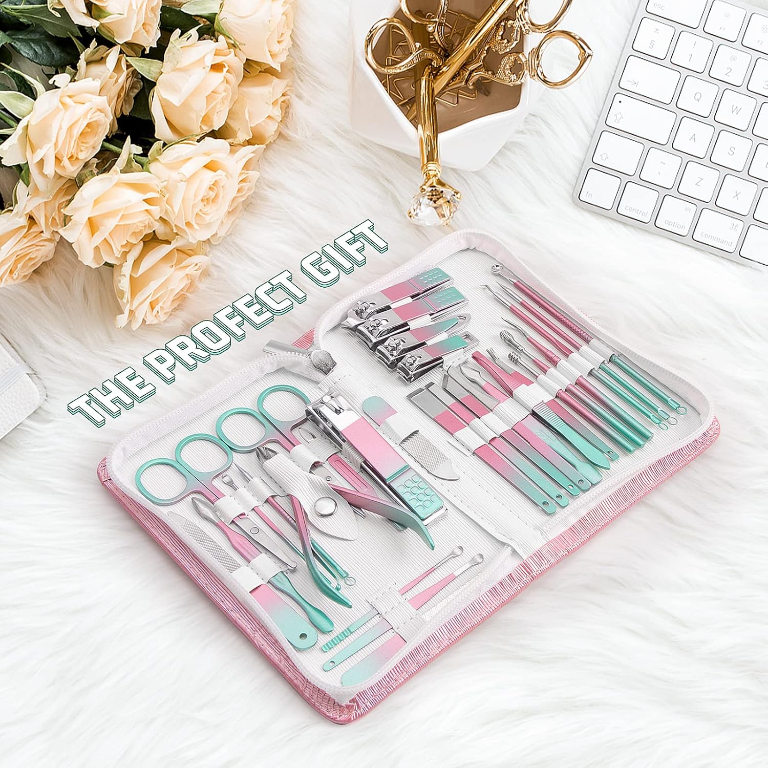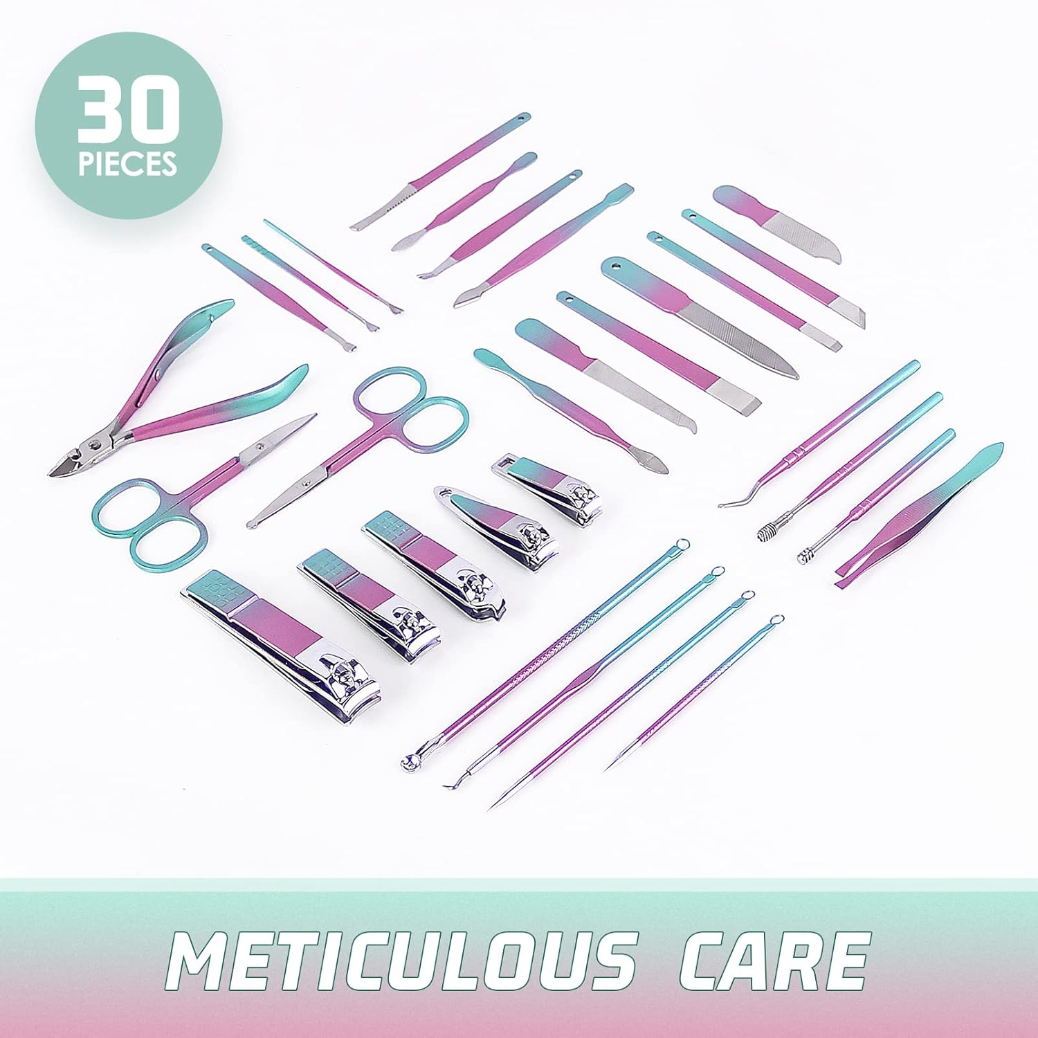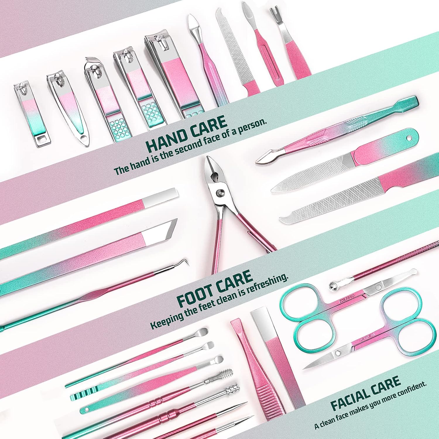 - 🥰【30 IN 1 UNIQUE MANICURE SET】:The professional manicure kit by WOAMA features a distinctive color gradient of pink and green and includes 30 pieces of nail, facial, and pedicure care tools.