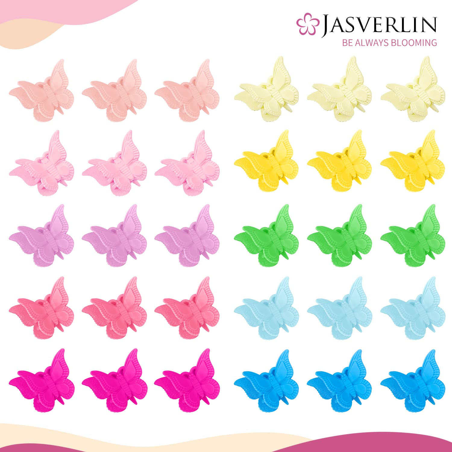 - Colorful Assortment: JASVERLIN's butterfly hair clips come in ten vibrant colors with five pieces per color. These versatile hues complement every hair color, adding an inspirational touch to your daily hairstyle, outfit, and makeup