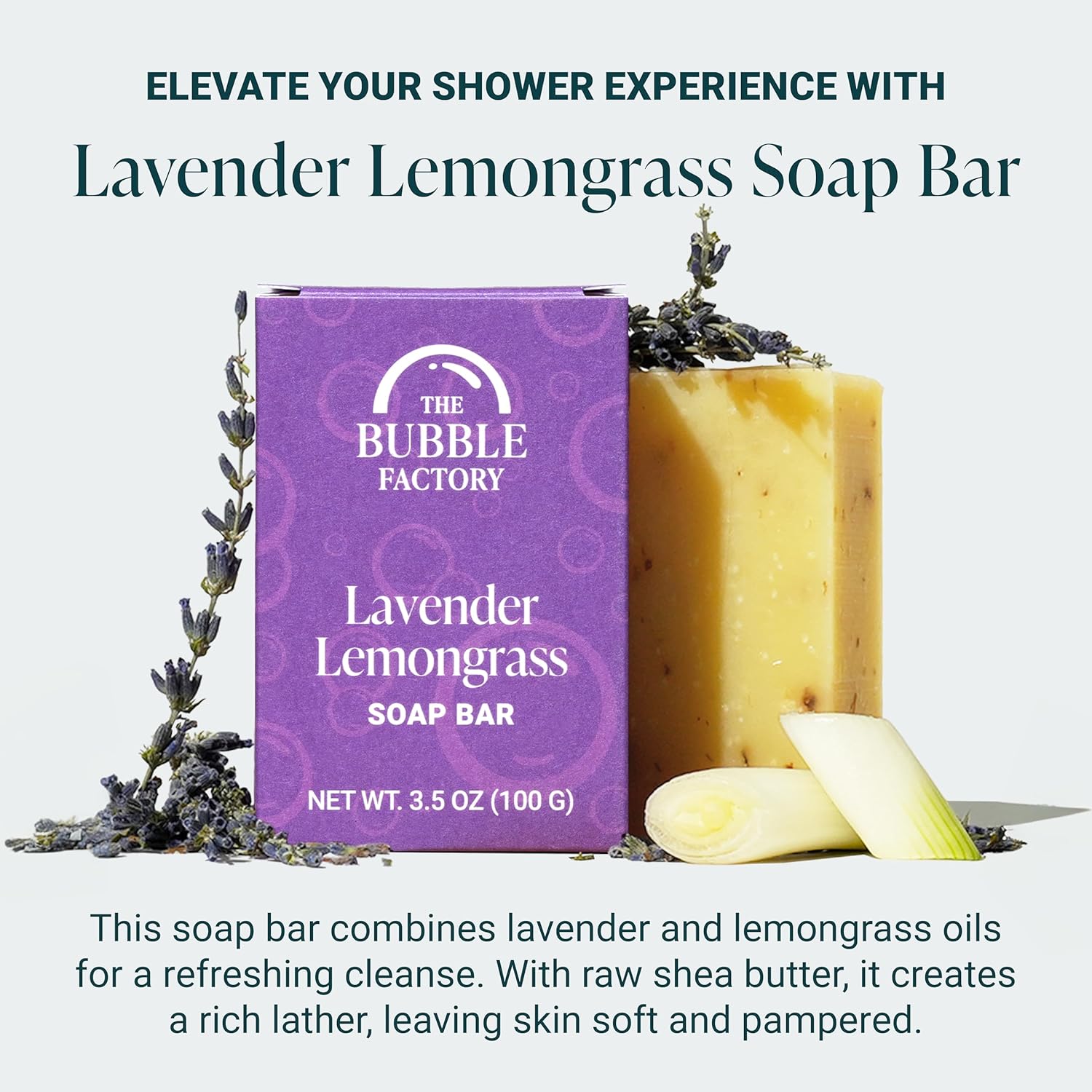 - LAVENDER LEMONGRASS SCENTED SOAP BAR: Features a delightful blend of calming Lavender and zesty Lemongrass essential oils for a refreshing and invigorating cleansing experience. Crafted with raw shea butter, it creates a rich, foaming lather, leaving your skin feeling pampered and soft.