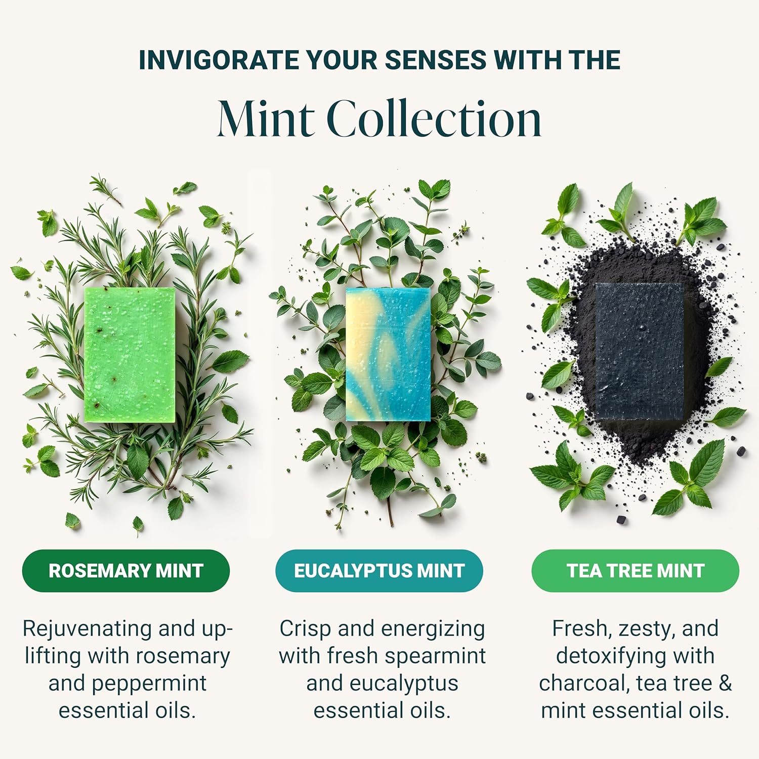 - MINT COLLECTION SCENTED SOAP BAR: Features all 3 of our mint soap bars - mint with invigorating eucalyptus and spearmint, detoxifiying activated charcoal powder and tea tree, and earthy rosemary essential oil. A cleansing experience that refreshes both body and soul. Crafted with raw shea butter, they creates a rich, foaming lather, leaving your skin feeling pampered and soft
