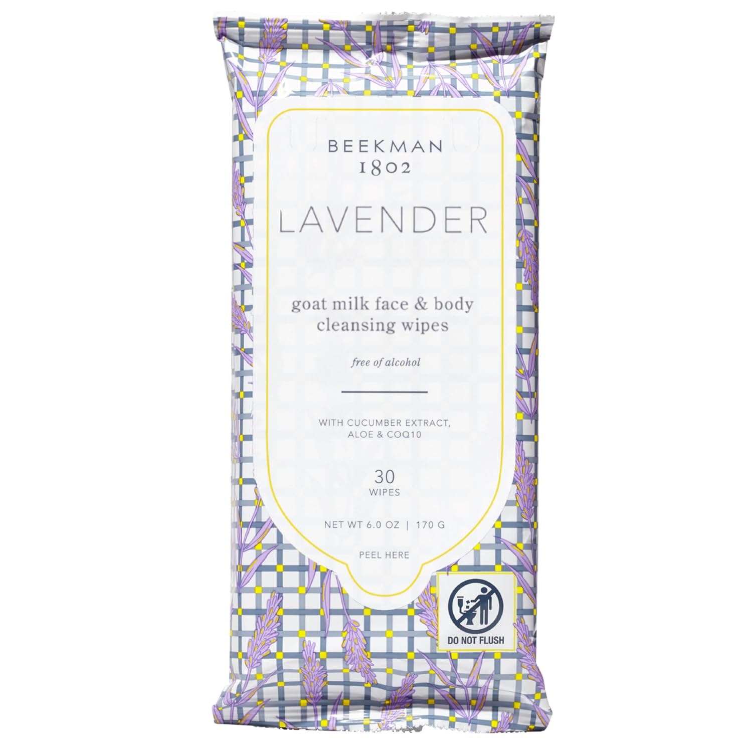 Beekman 1802 Face & Body Wipes, Lavender - Scented - 30 Count - Cleanses - With Goat Milk, Aloe & Vitamin E - Alcohol Free, Biodegradable - Good for Sensitive Skin - Cruelty Free