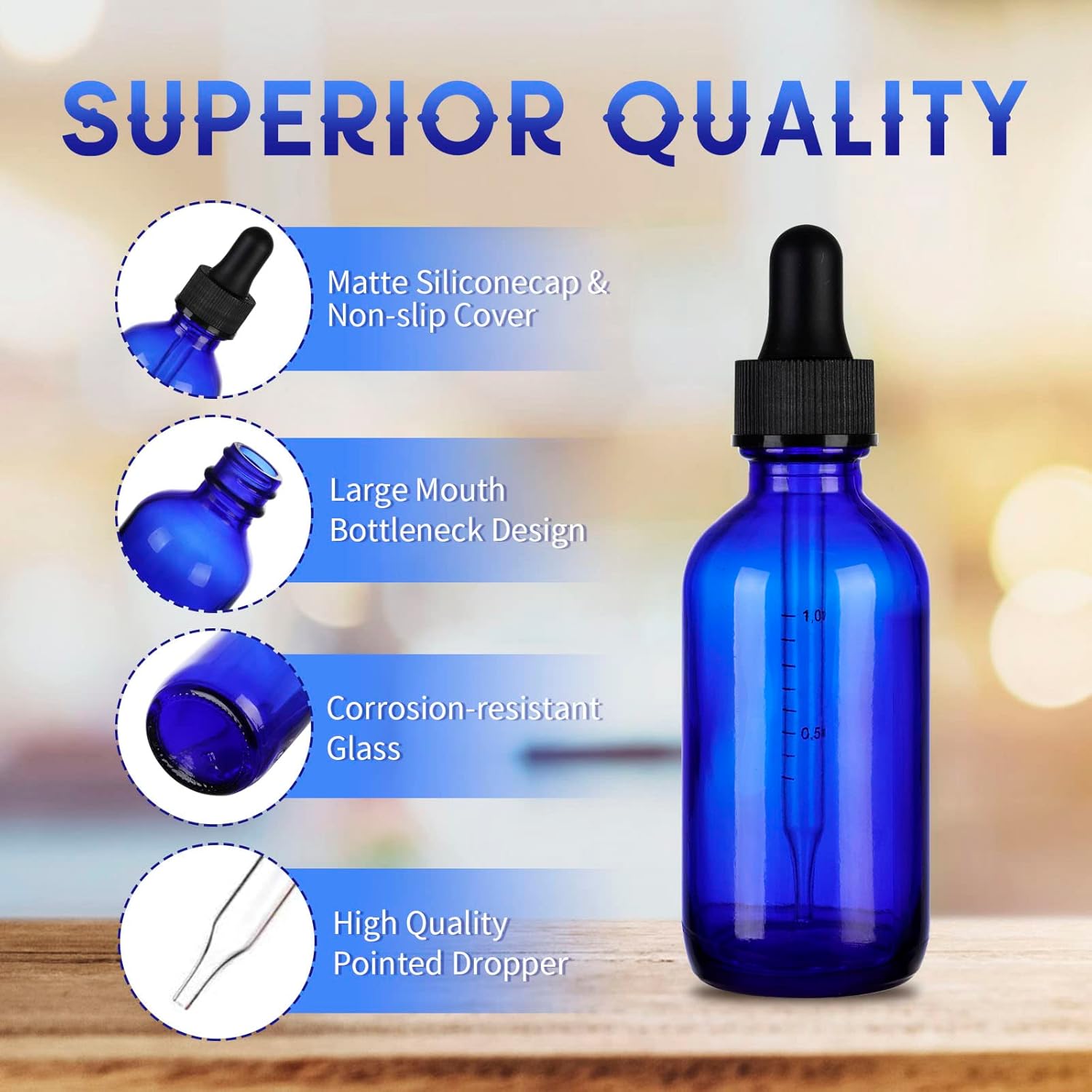 - 【High Quality Glass Dropper Bottles】These essential oil dropper bottles are made of sturdy and beautiful blue glass, leak-proof black caps and corrosion-resistant silicone tops. The glass bottles with eye droppers are removable and reusable, long pipettes help dispense and drop oils precisely.