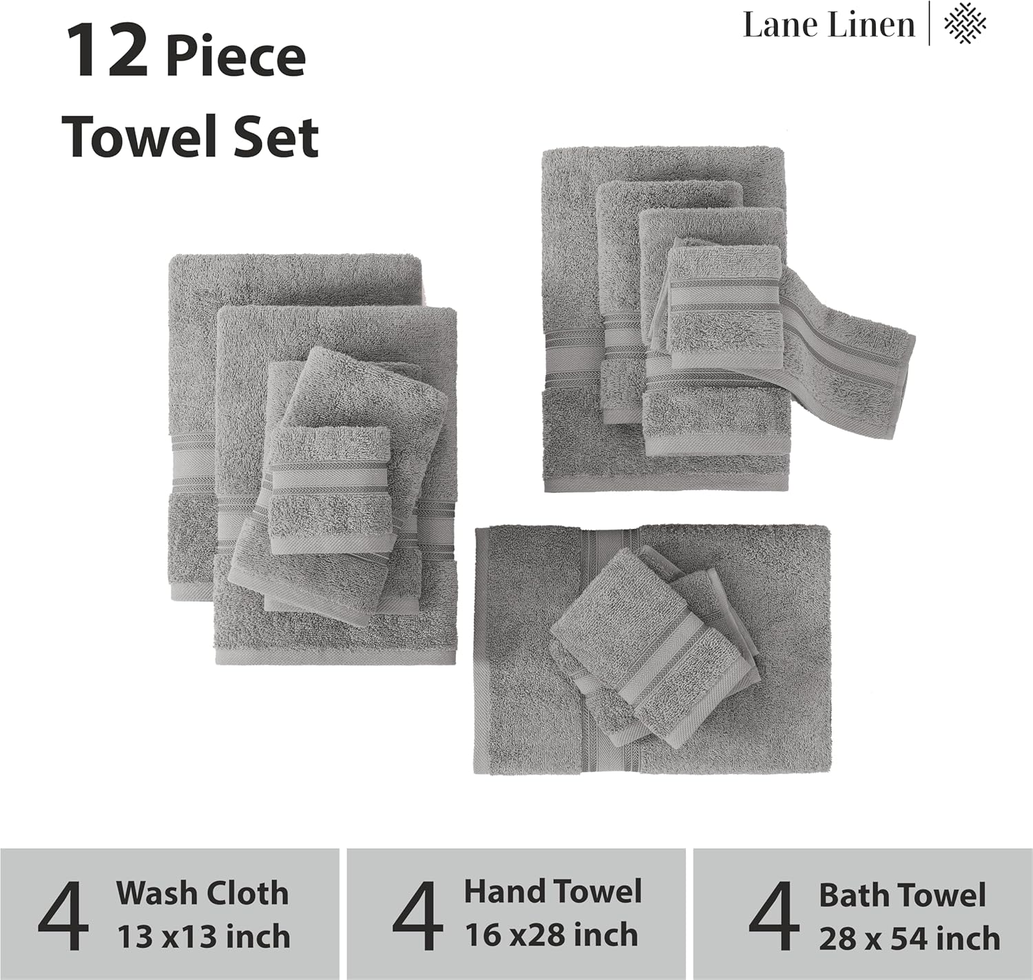 LANE LINEN Luxury Bath Towels Set - 12 Piece (4 Bath Towels, 4 Hand Towels, 4 Washcloths), 100% Cotton, Zero Twist, Super Soft & Extra Absorbent - Space Grey