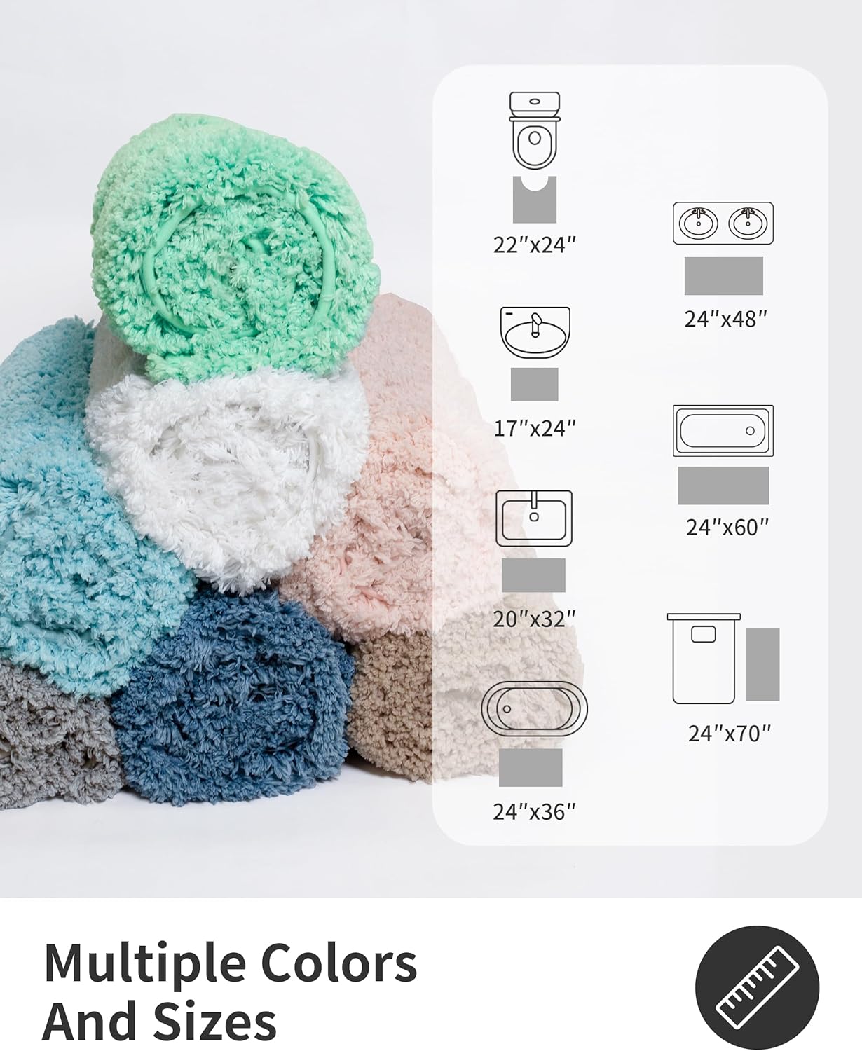 - Diverse 6 Color and 7 Sizes Options:we offer a variety of sizes,such as 17x24 to 24x70 and rich colors,such as white,pink,grey,blue,teal,spa blue to meet different spatial and personalized needs.whether it's a small washbasin or a spacious bathtub,you can find the excellent matching style