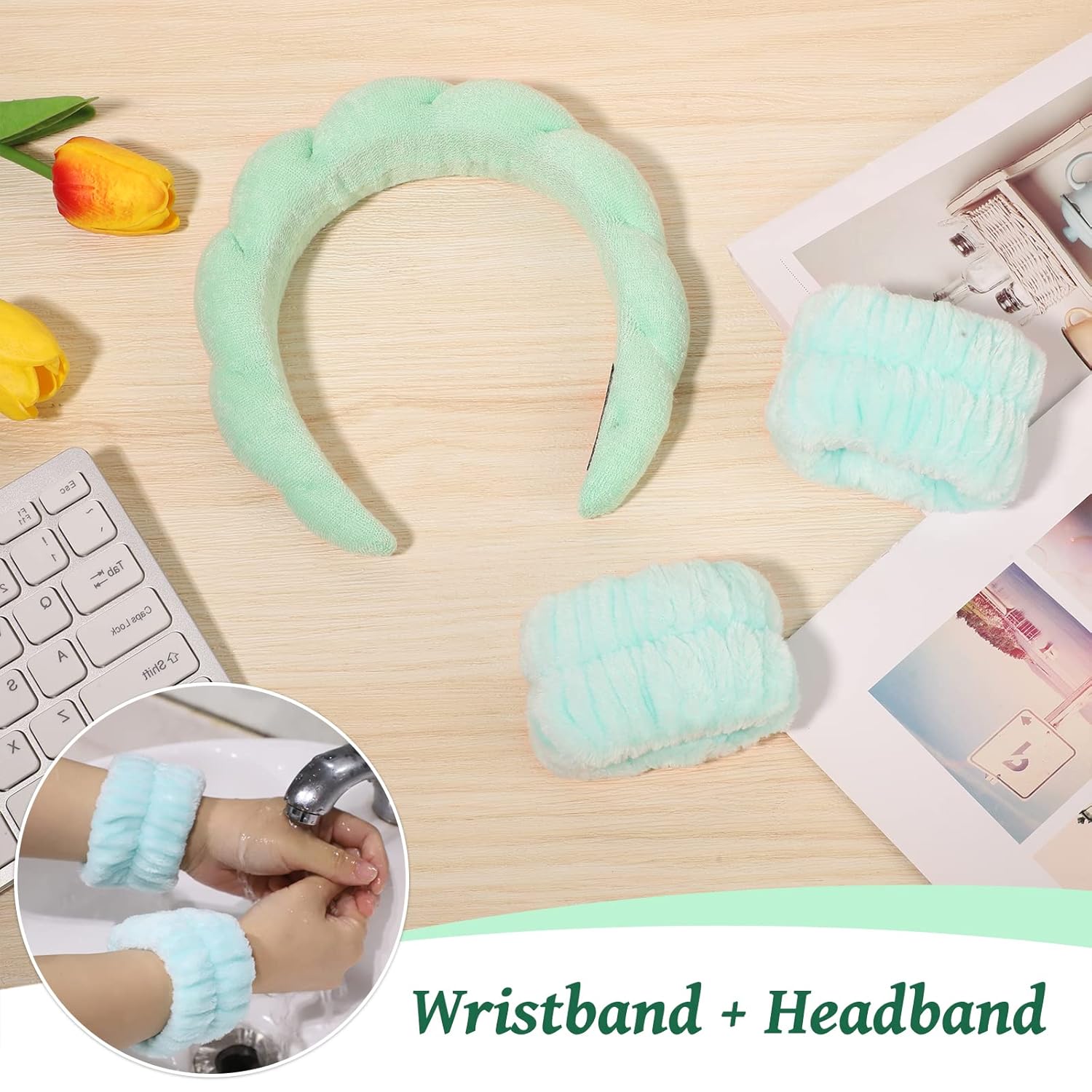 WSICSE Sponge Spa Headband for Women, Green Makeup Headband and Wrist Washband Set for Face Washing, Skincare, Shower, Makeup Removal
