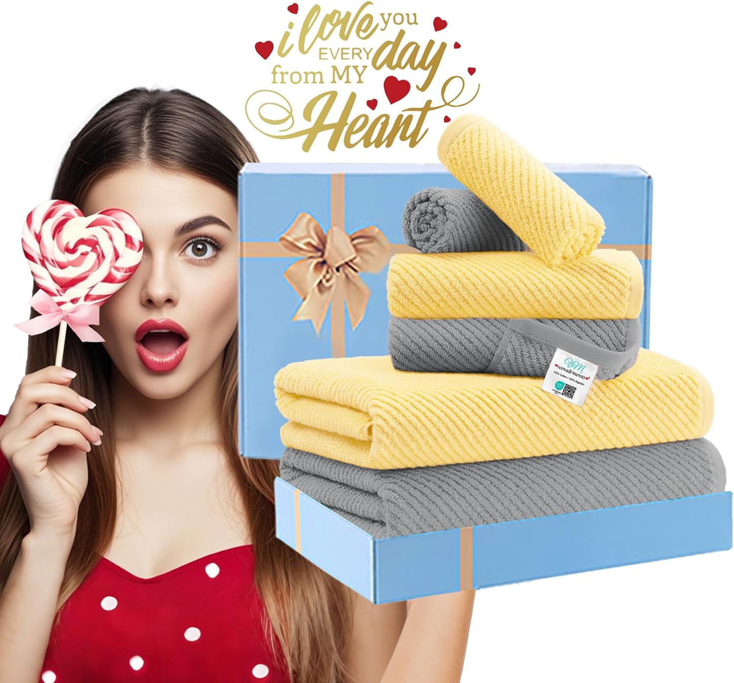 VOOVA & MOVAS Towels for Bathroom, Bath Towels with Hanging Loop - 100% Cotton | Soft | Quick Dry | Thick, Towel Set of 6, 2 Large Bath 30"x56", 2 Hand 18"x28", 2 Washcloths 13"x13", Grey and Yellow