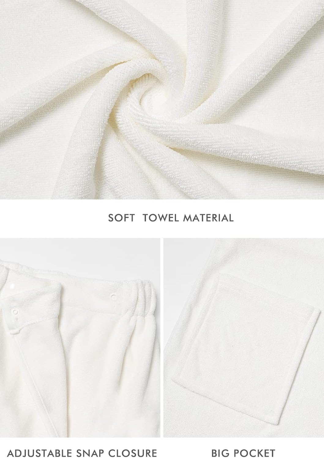 - Intimate Design: The terry cloth robe for women wrap bath has a snap closure design that makes it easy to put on and take off. The back of the spa towel wrap is designed with elastic bands to make you comfortable to wear.And there is a big pocket on the terry cloth spa bath wrap, which can hold mobile phones or cosmetics, etc.Which provides you with more convenience.