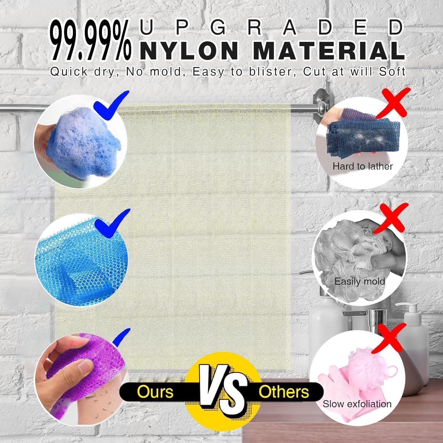 - 【More efficient cleaning】The exfoliating body net is rougher than a ordinary bathing cloth, but soft enough for daily body cleansing.easy for removing dead skin, dirt, oil, and eliminating impurities, unclogging pores, suitable for women and men of most ages to use