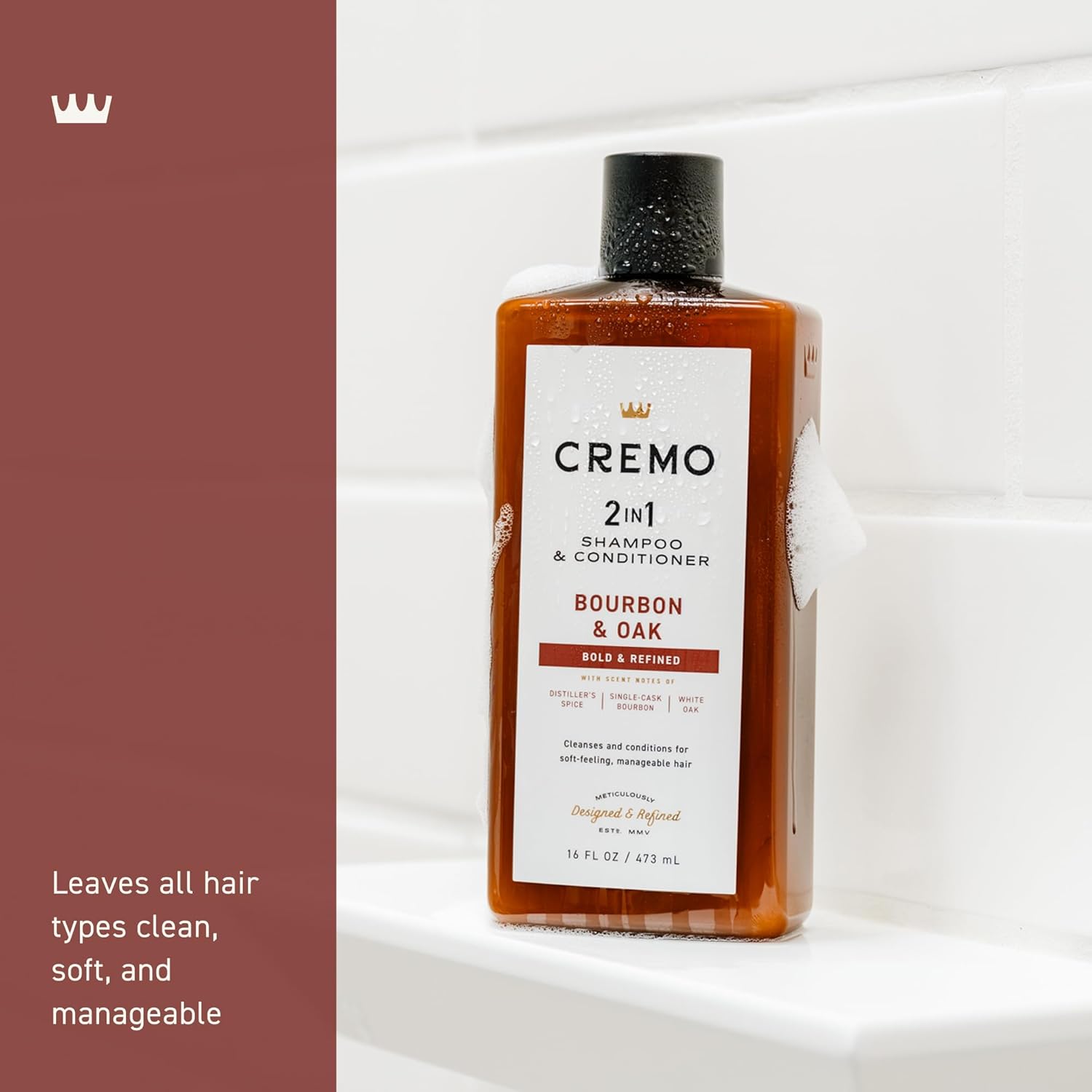 Cremo Bourbon & Oak 2-in-1 Shampoo & Conditioner, Barber Grade Quality That Moisturizes and Cleanses All Hair Types, 16 Fluid Ounce