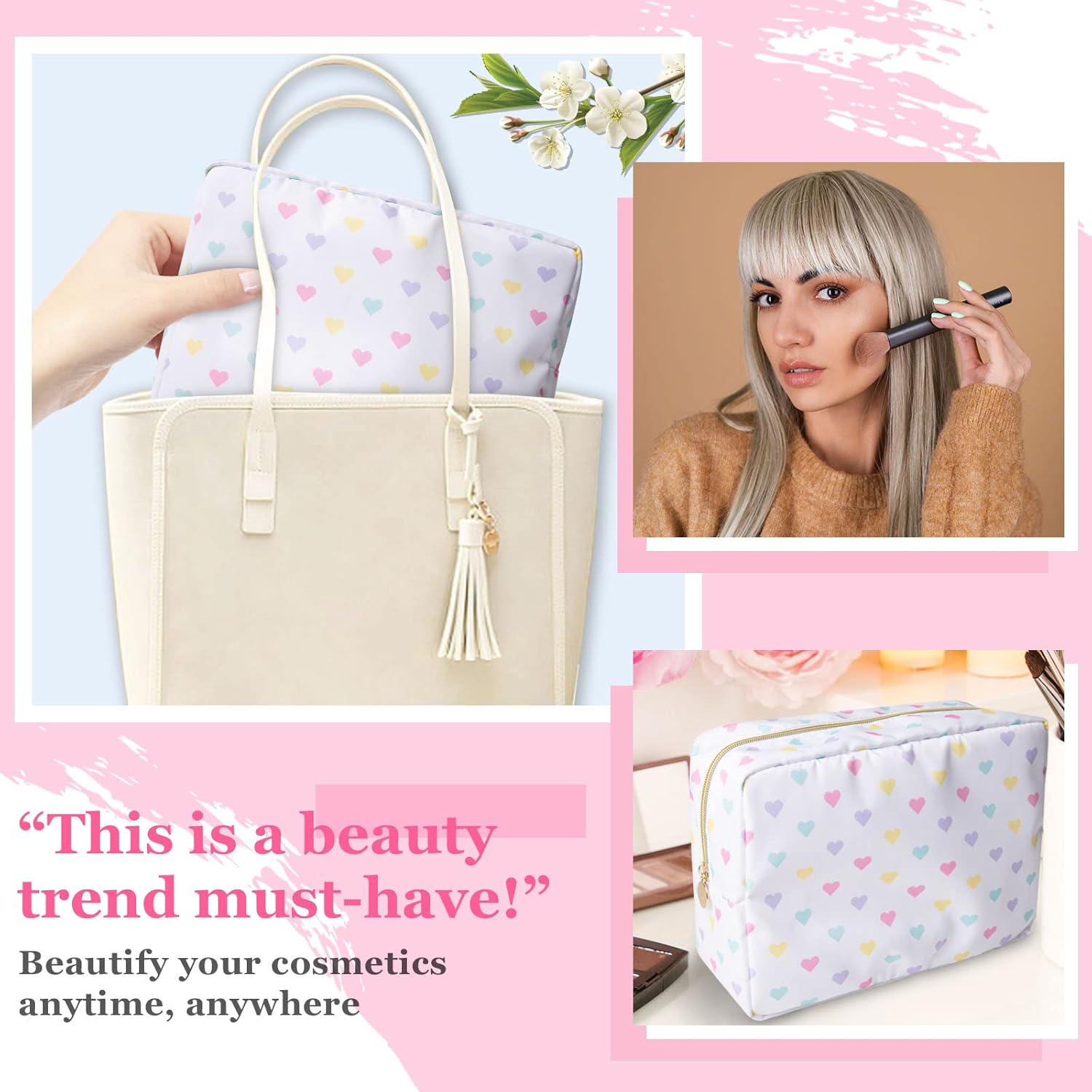 Nylon Large Makeup Bag Travel Cosmetic Bag Pouch, Big Preppy Makeup Bag Cute Cosmetic Zipper Pouch Purse, Waterproof Toiletry Bag Clutch Makeup Organizer Travel Essentials for Women Girl(White-Heart)
