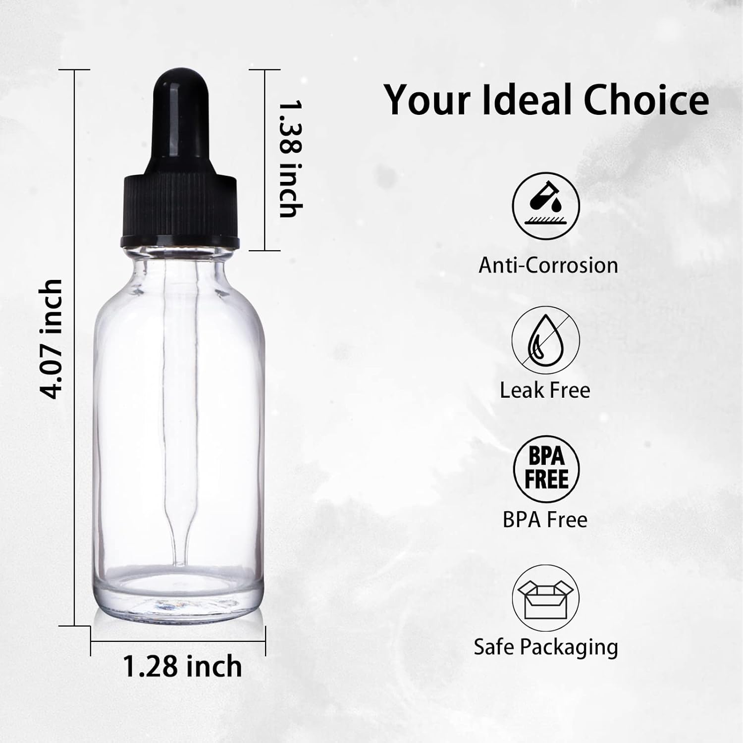 - Package List: 48 Pack 1 oz (30 ml) Clear Glass Dropper Bottles, 2 Extra Glass Eye Droppers, 1 Brush, 2 Funnels, 1 Measuring Cup (30ml) and 54 Pieces Labels.
