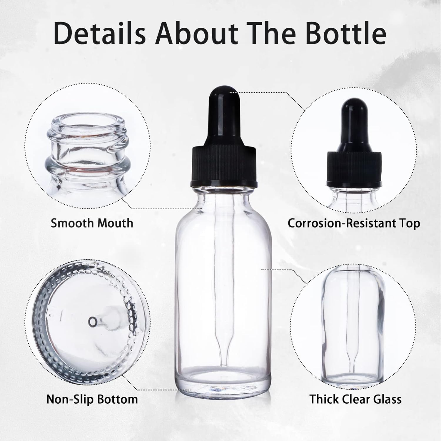 - Premium Quality: These essential oil dropper bottles are made of thick, sturdy-feeling glass, wear-resistant and corrosion-resistant, can be used repeatedly. Also, our clear bottles feature high-transparency glass walls, allowing you to see the liquid clearly.