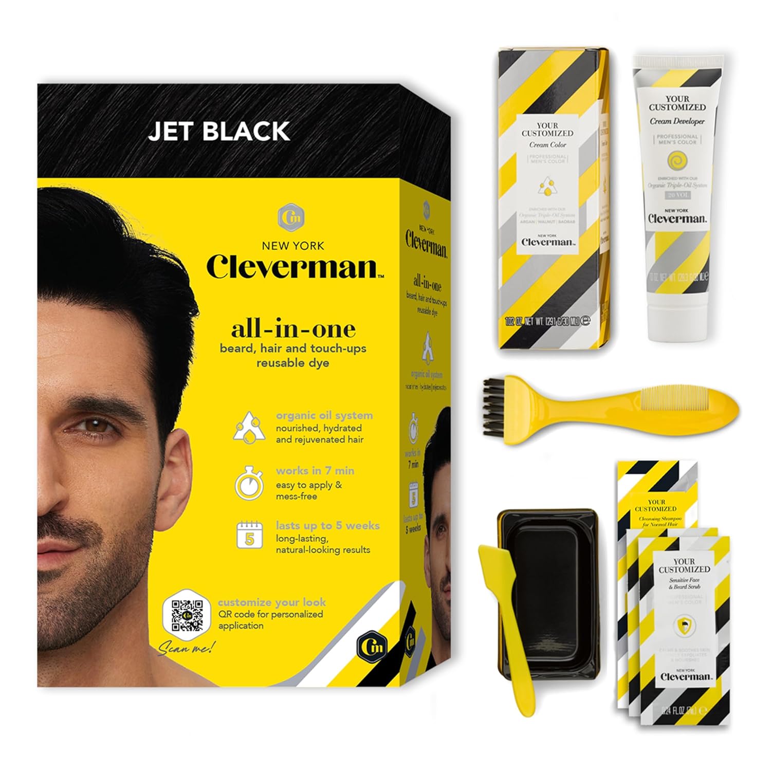 CLEVERMAN Jet Black Hair & Beard Dye for Men, All-in-One Reusable Kit - Permanent, Ammonia-Free, Professional-Quality and Natural-Looking Gray Coverage for Hair, Beard & Mustache