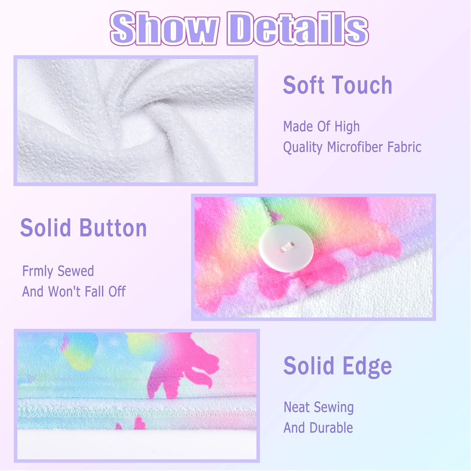 - Easy To Use&Save Time-A Button And A Loop At The Back to Secure The Head Towel Wrap, You Just Simply Put Wet Hair into Our Hair Turban, Then Gently Twist And Loop It Into Place, Hair Will Not Slip While Doing Things After Shower.With This Design, The Hair Turban Will Not Fall Off Your Head Whenever Your Are Sitting Or Lying. So You'll Have Extra Time To Do Your Make Up, Have A Coffee, Or Relax In A Warm Bubble Bath. Kids Can Continue Reading Or Playing While Letting Hair Drying.