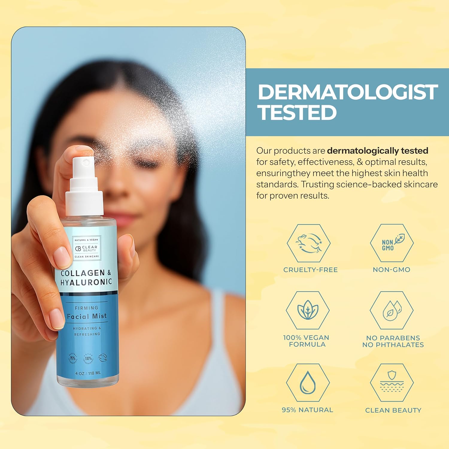 Clear Beauty Hyaluronic Acid & Collagen Face Mist - Dermatologist Tested, Moisturizes & Tones Skin, Anti-Aging, Natural Ingredients, Cruelty-Free, 95% Natural - All Skin Types - 4 OZ
