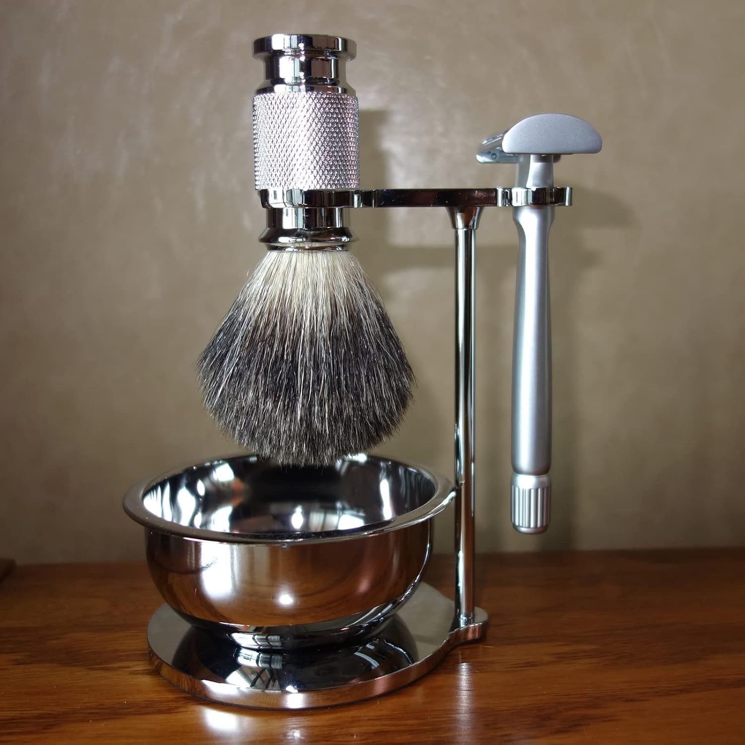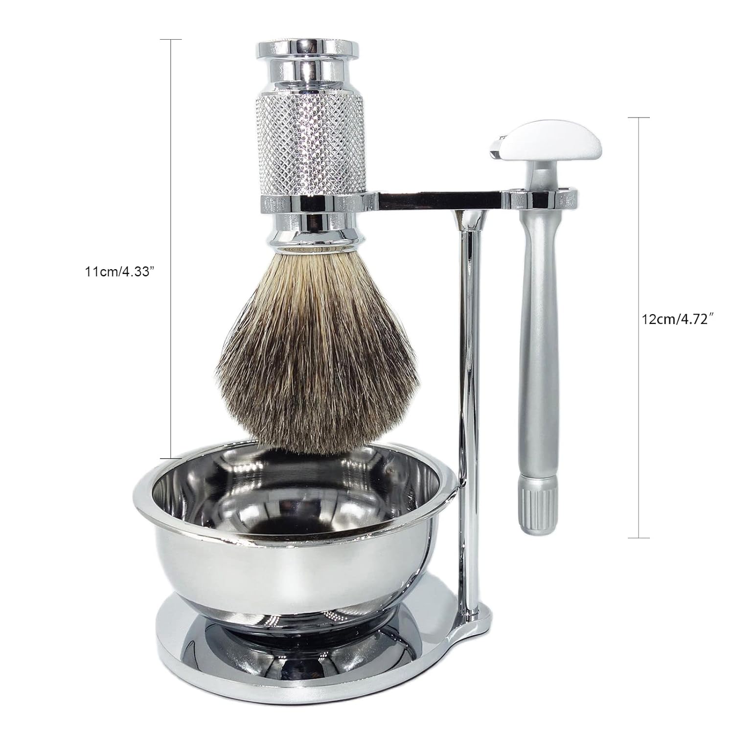 - Ideal Shaving Kit:4 in 1 wet shave kit include Manual double edge safetry razor,10 blades refills,badger hair Lather brush,soap bowl and heavy weight stand holder.