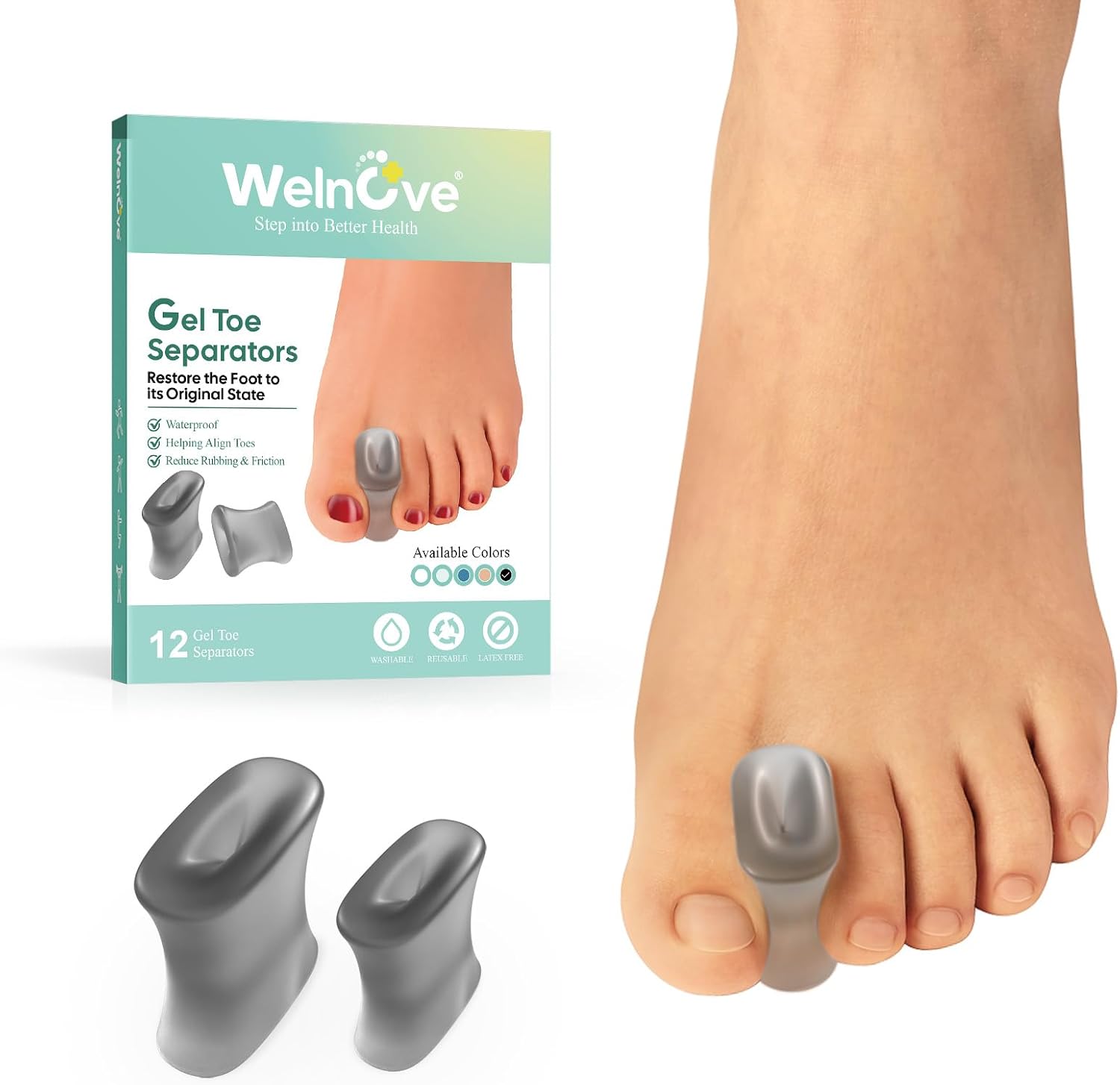 Welnove 12-Pack Gel Toe Separators – Bunion Pads – Toe Spacers for Straightening Overlapping Toes for Men and Women - Transparent Black