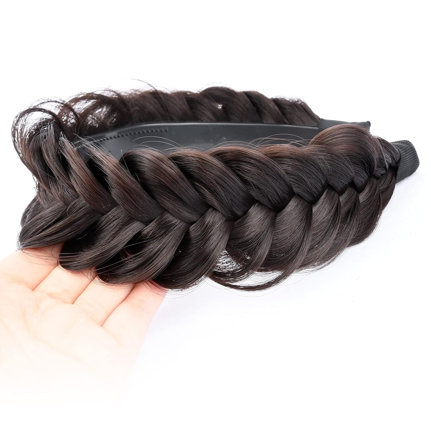 DIGUAN Wide Messy Braided Headband With Teeth Synthetic Hair Plaited Headband High Elasticity Braids Chunky Fishtail Braided Hair Band Hairpiece for Girls Women (Deep Brown)