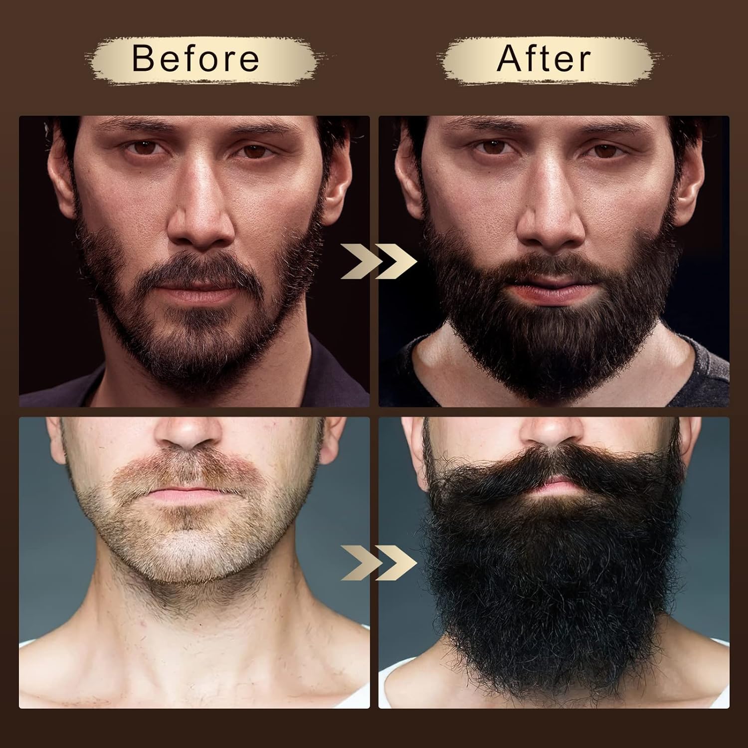 - Beard oil: Carefully selected natural beard oil formula contains jojoba Oil, grapeseed Oil and hydrogenated sweet almond oil. These essences ingredients can effectively penetrate the skin and reach deep into the hair follicles, helping to wake up sleeping hair follicles, repairing damaged hair follicles and promoting beard growth. A premium beard oil can tames frizzy facial hair and naturally nourishes your beard, leaving it looking softer, fuller, and shinier.