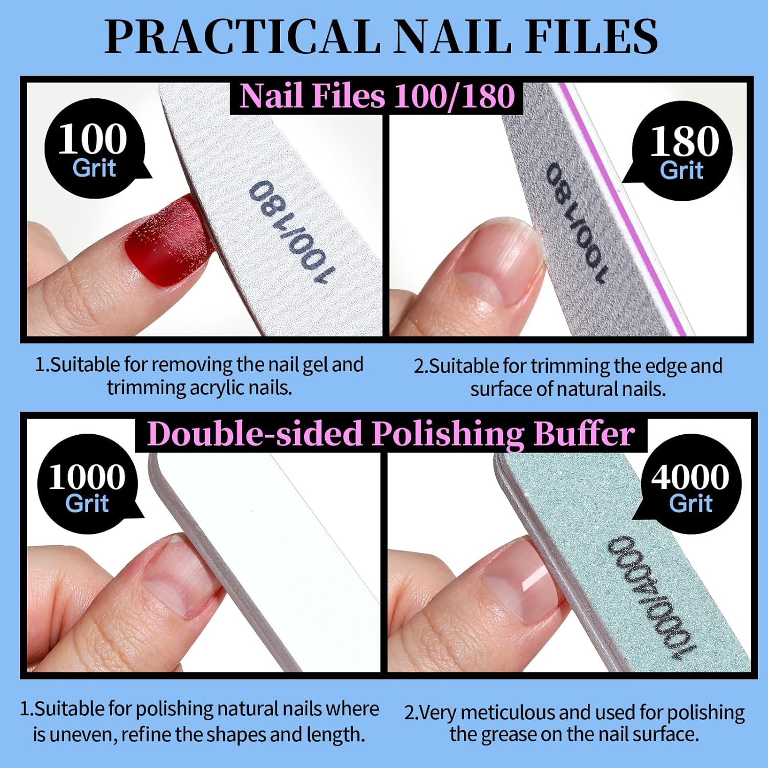 - Practical Nail Care Kit For Filing & Polishing: The nail files 100/180 grit are coarse-grained, suitable for removing nail gel or nail polish, also for toenails. For accurate filing on the edges of the nail and trimming the shapes and length according to your needs. The buffer and polishing files are suitable for polishing uneven nail surface to make your nails smooth and shiny. The small nail brush can help to easily brush the residue off the nails.