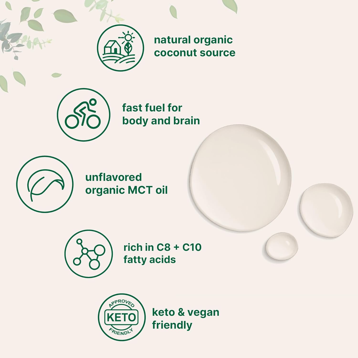 MCT Oil Organic, 32 fl oz |100% Virgin Coconut with C8 + C10 Fatty Acids | Natural Fuel for Brain Energy & Ketone Production | Great for Coffee or Dressings | Unflavored, Keto, Vegan
