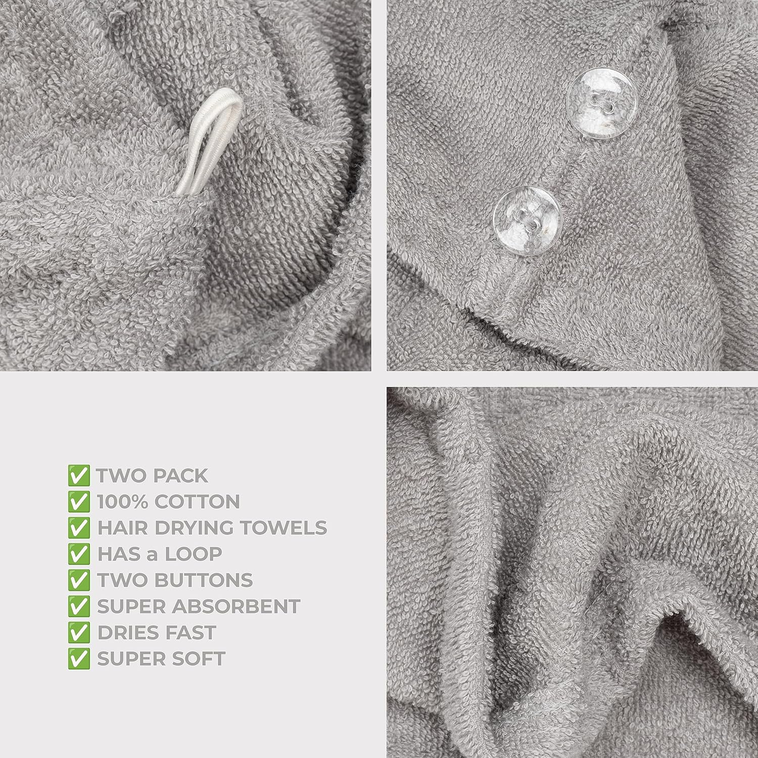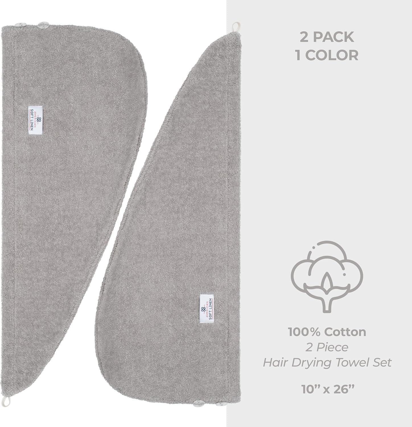 American Soft Linen 100% Cotton Hair Towels for Women, Head Towel Cap, Cotton Hair Turban Towel Wrap for Long Curly Anti Frizz Hair, Soft and Absorbent Cotton Hair Towels 2 Pack, Light Gray