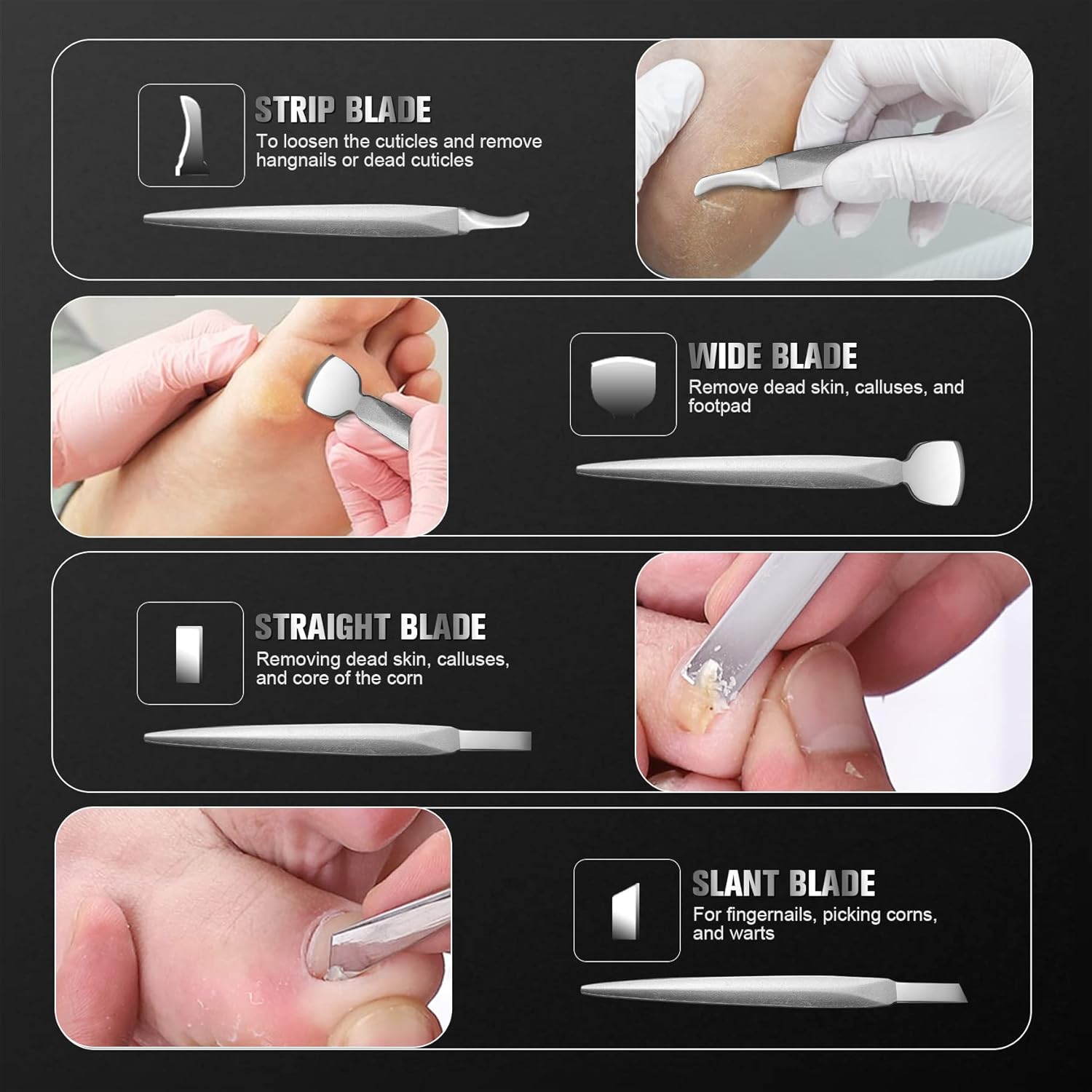 - Super Sharp Pedicure Blades: - These foot knives and toenail clippers set is made of 420j2 surgical grade stainless steel, known as one of the most durable blades to resist rust