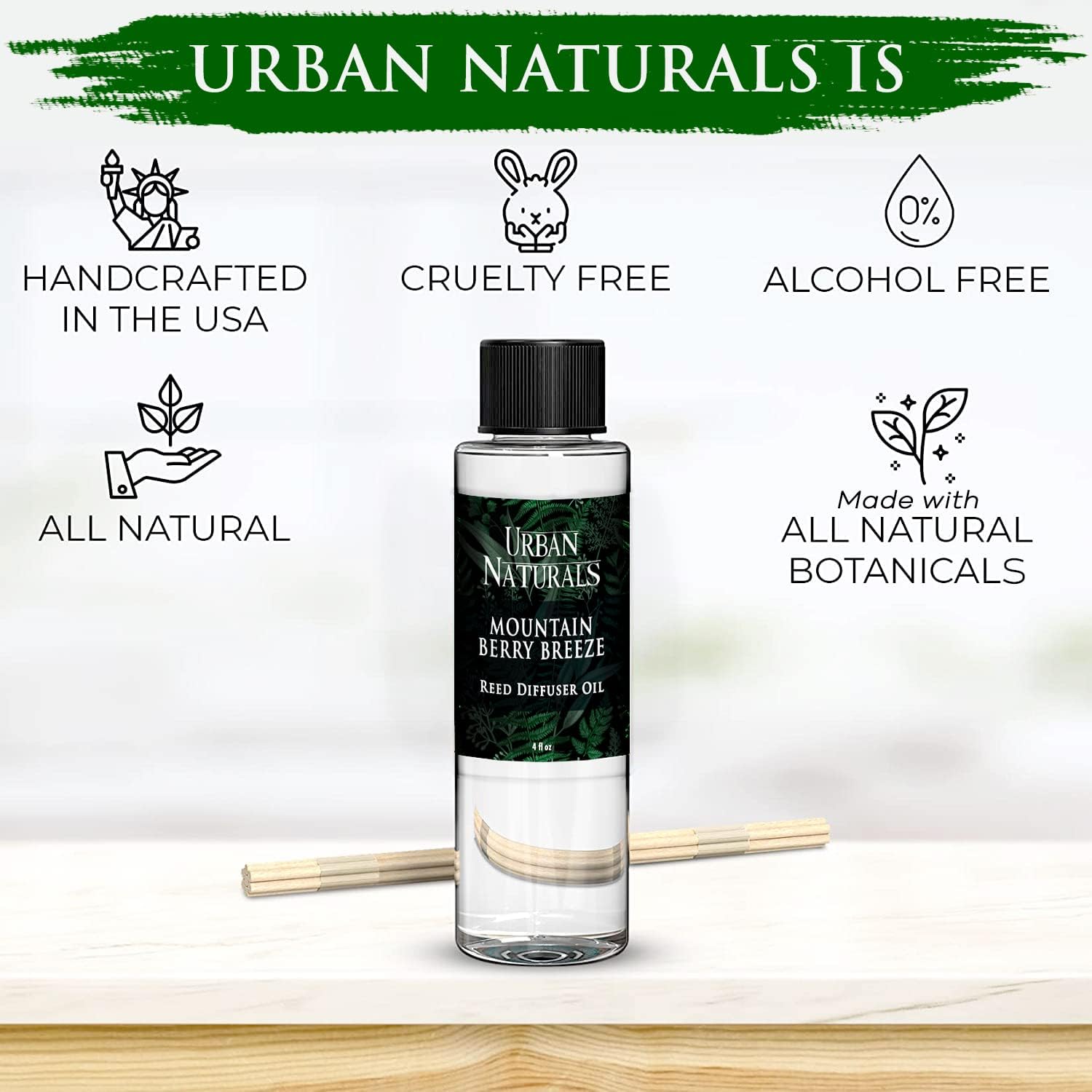 Urban Naturals Reed Diffuser Oil Refill, Mountain Berry Breeze Diffuser Oils with Juniper, Jasmine, Apple, 4 oz + Free Reed Sticks, Made in The USA