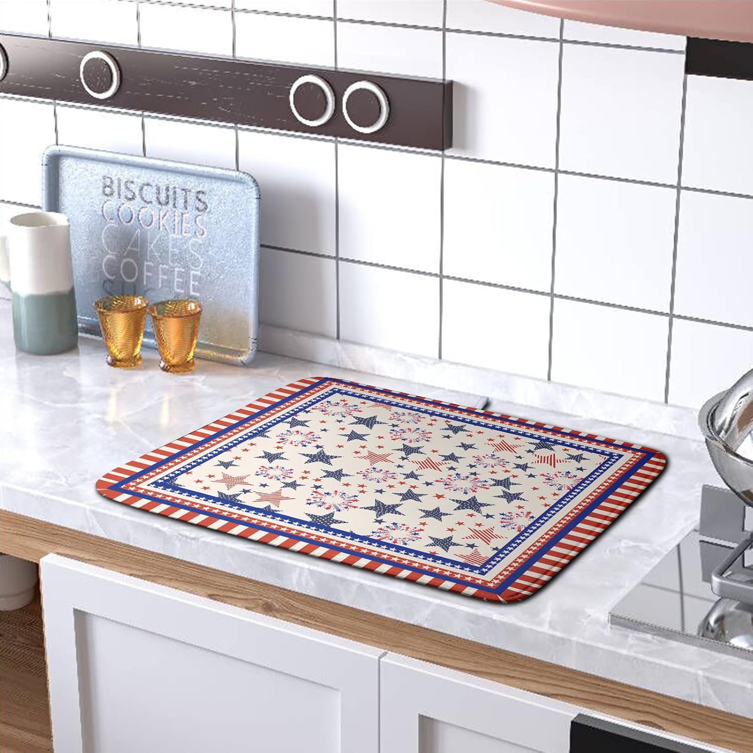 Happy 4th of July Patriotic Dish Drying Mat 16 x 18 Inch US Independence Day Vintage Star Kitchen Drying Mat Blue White Red Dish Drainer Mats Super Absorbent Dish Rack Pad for Coffee Bar Sinks