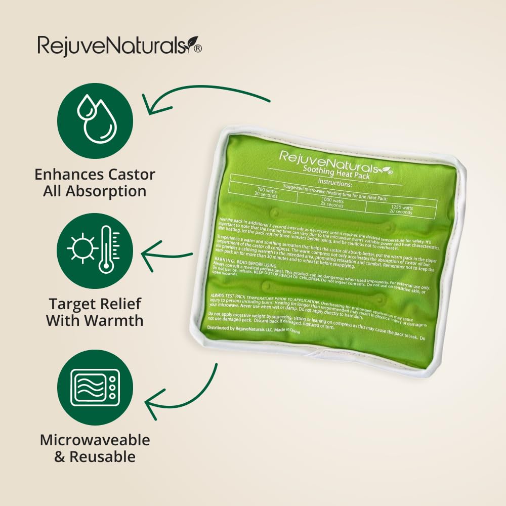 - Soothing & Relaxing Heat Pack: While our castor oil pack is designed to naturally hold in body heat, we've incldued a soothing heat pack as a bonus for added relaxation. It can be used to provide to help the castor oil absorb quicker. The pack is microwaveable and reusable, making it a convenient and cost-effective solution.