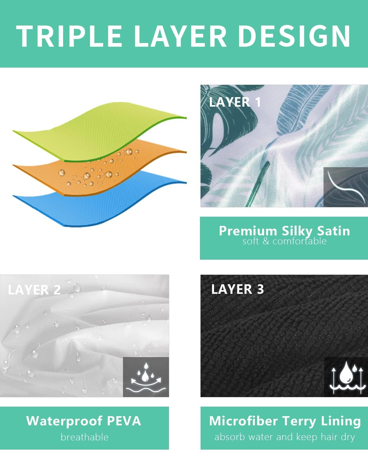 - 【TRIPLE-LAYER DESIGN】Our waterproof shower caps are made with a soft satin fabric, waterproof EVA cloth, and terry cloth for extra absorption. Say goodbye to soggy hair